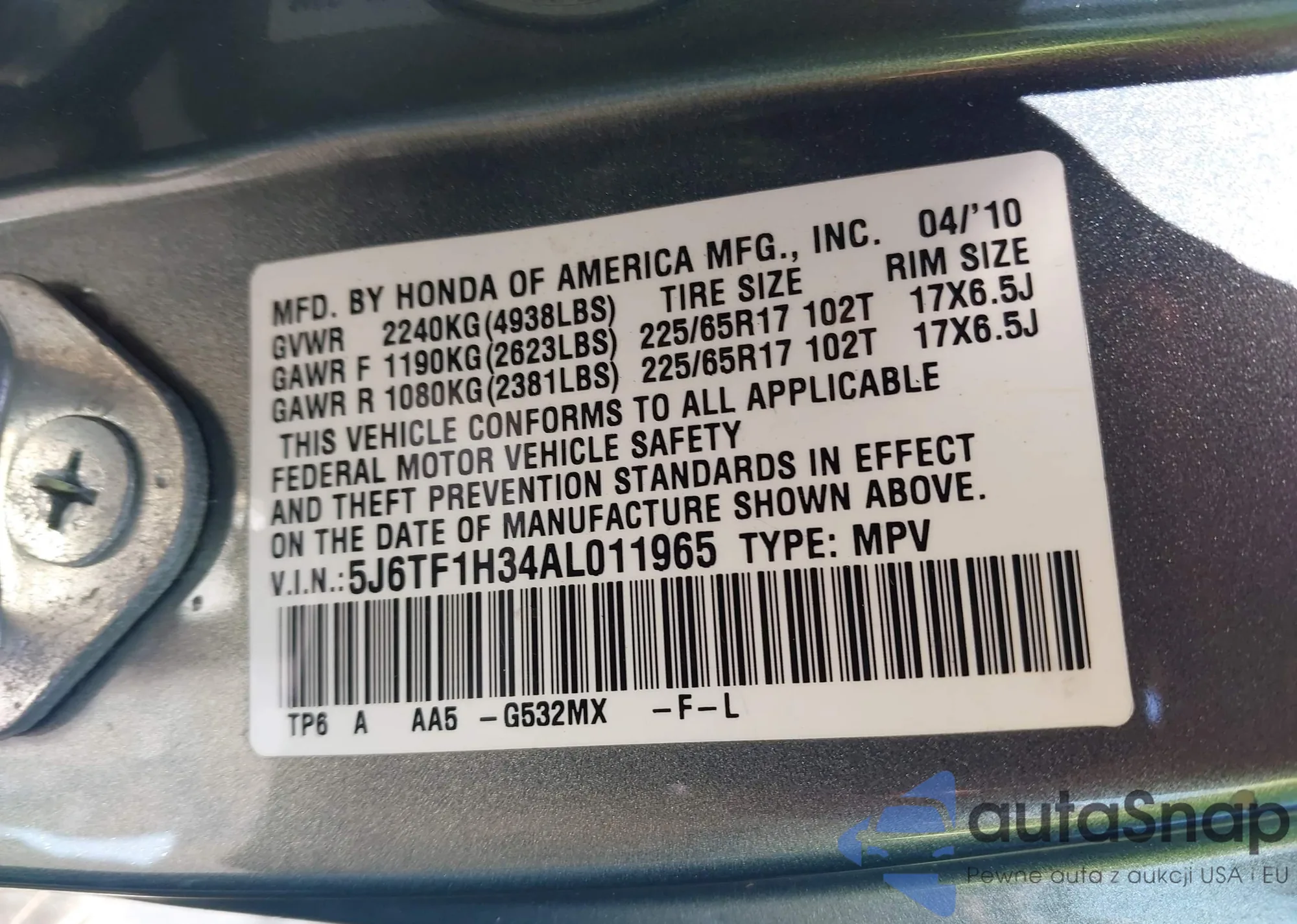 • VIN 5J6TF1H34AL011965