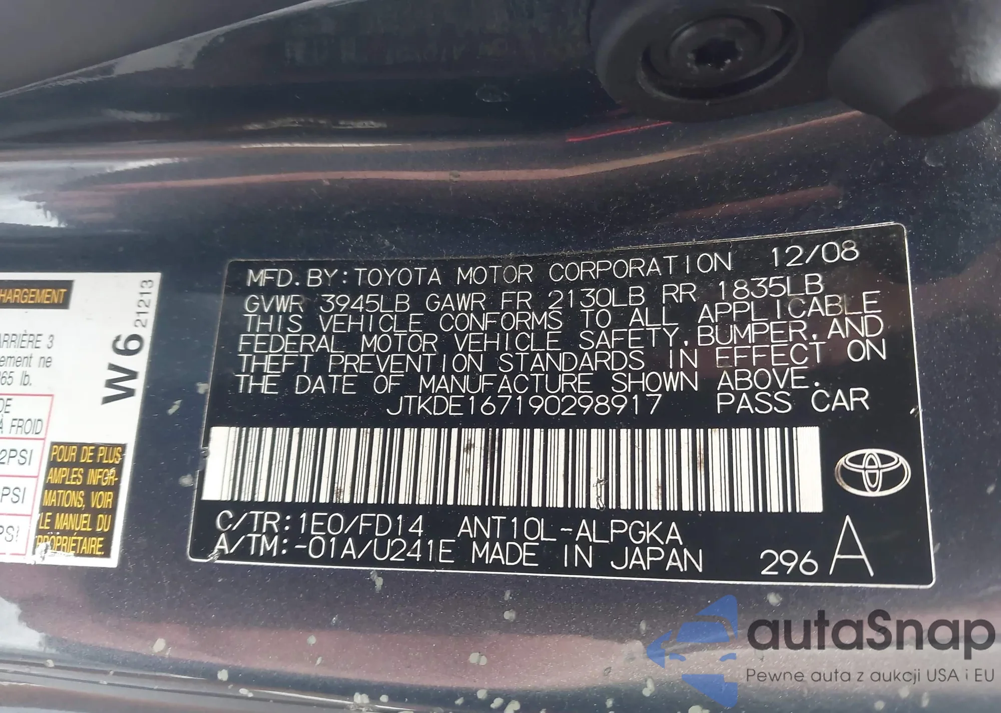 LOT: 43396722 VIN: JTKDE167190298917