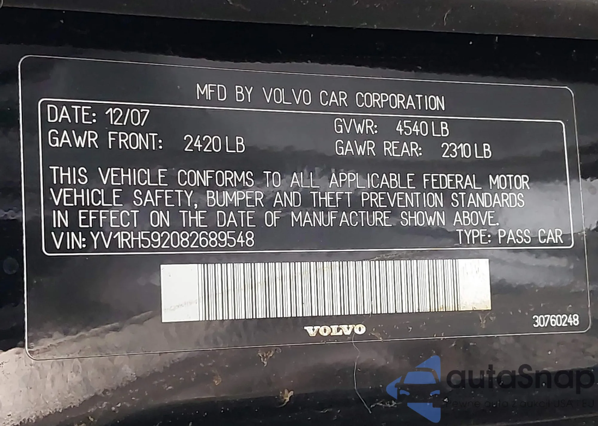 LOT: 43442037 VIN: YV1RH592082689548