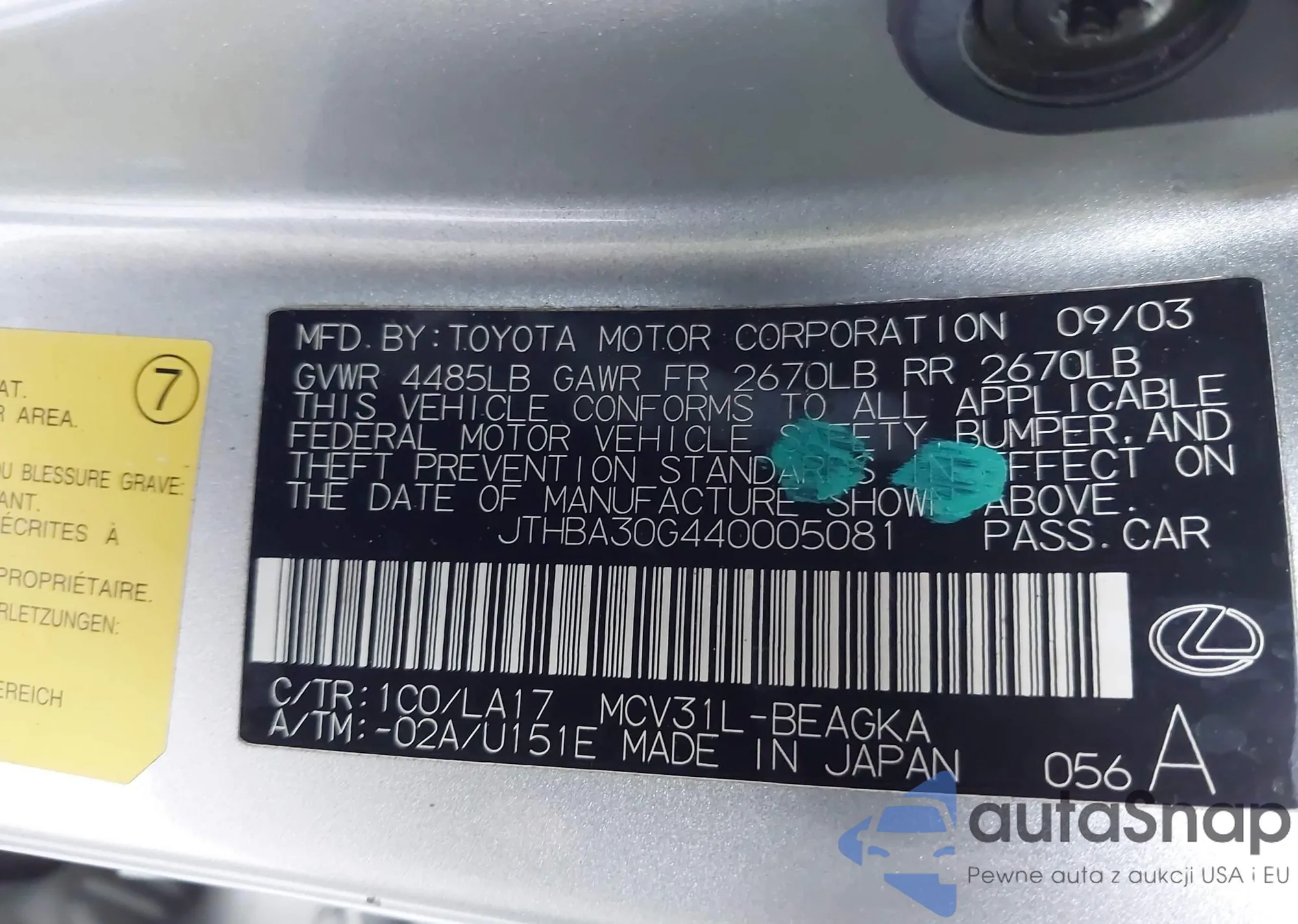 LOT: 43432902 VIN: JTHBA30G440005081