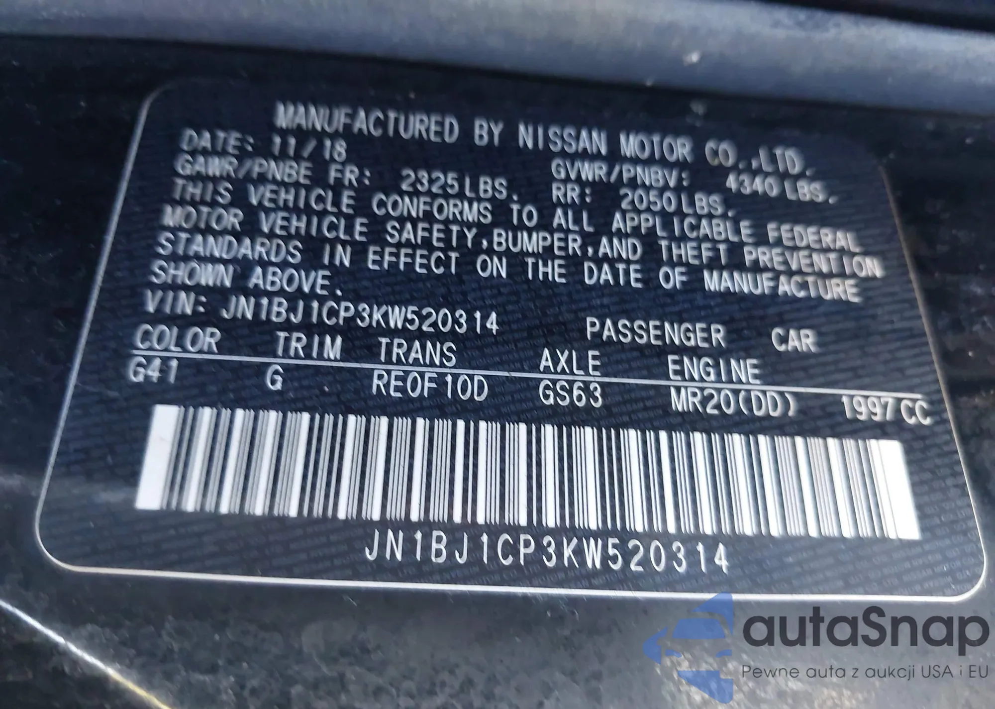 LOT: 43351581 VIN: JN1BJ1CP3KW520314