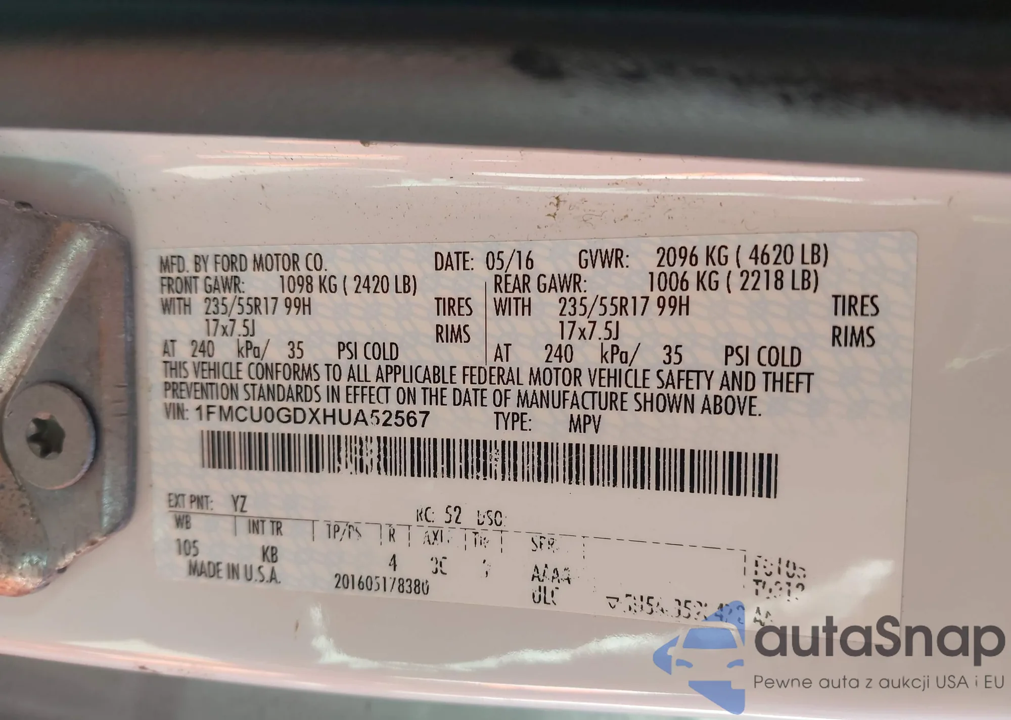 LOT: 43502905 VIN: 1FMCU0GDXHUA52567