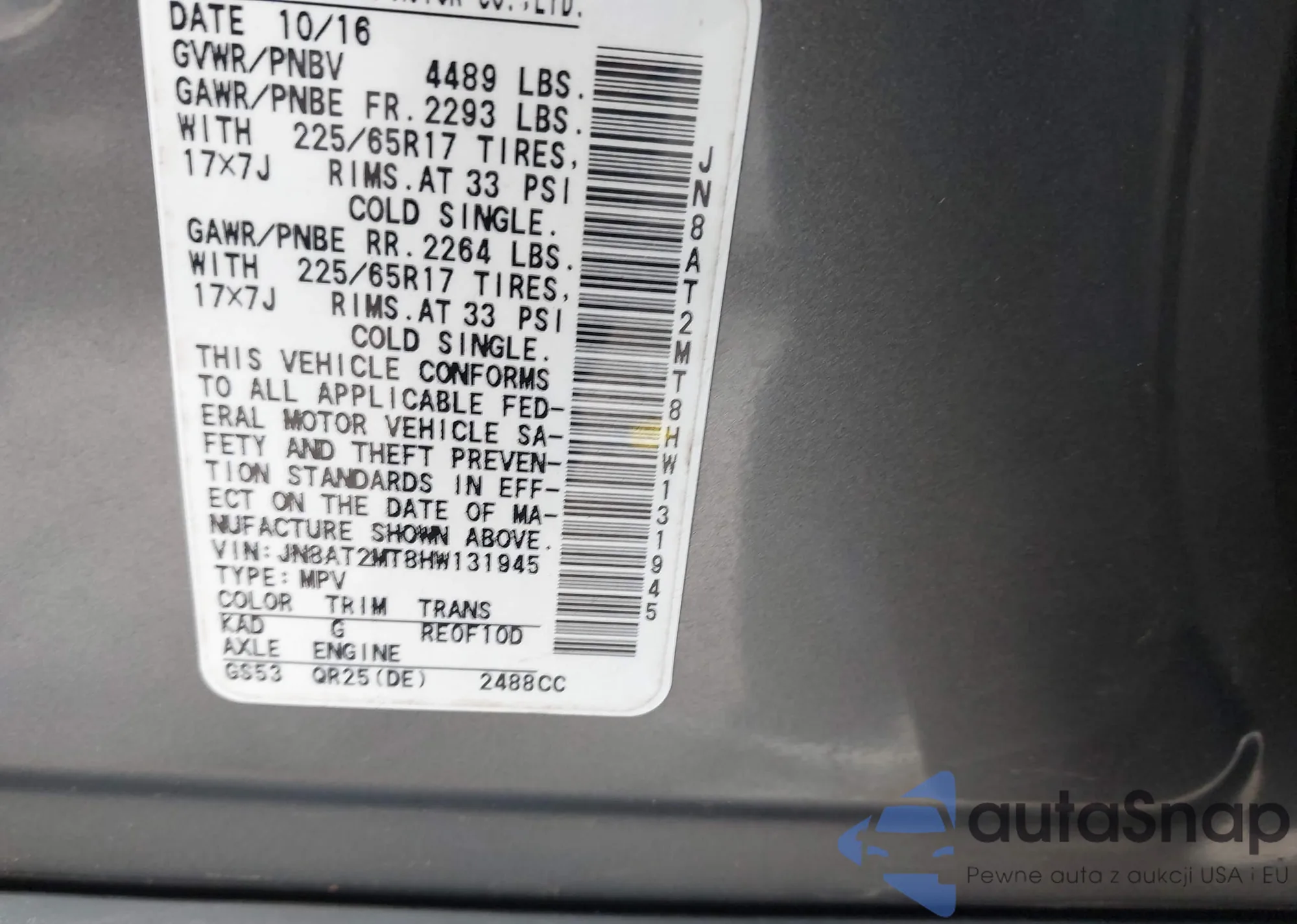 LOT: 43417840 VIN: JN8AT2MT8HW131945