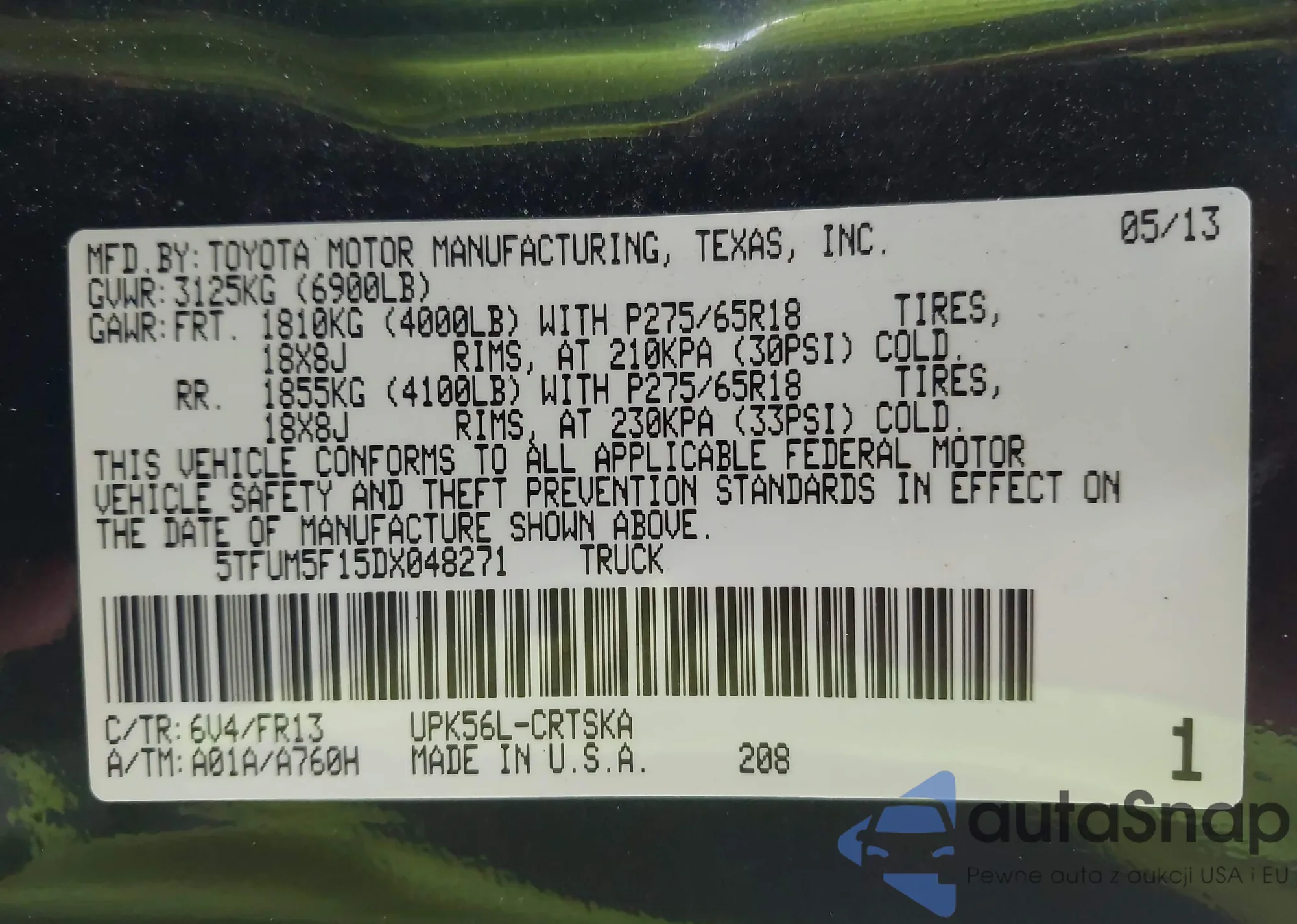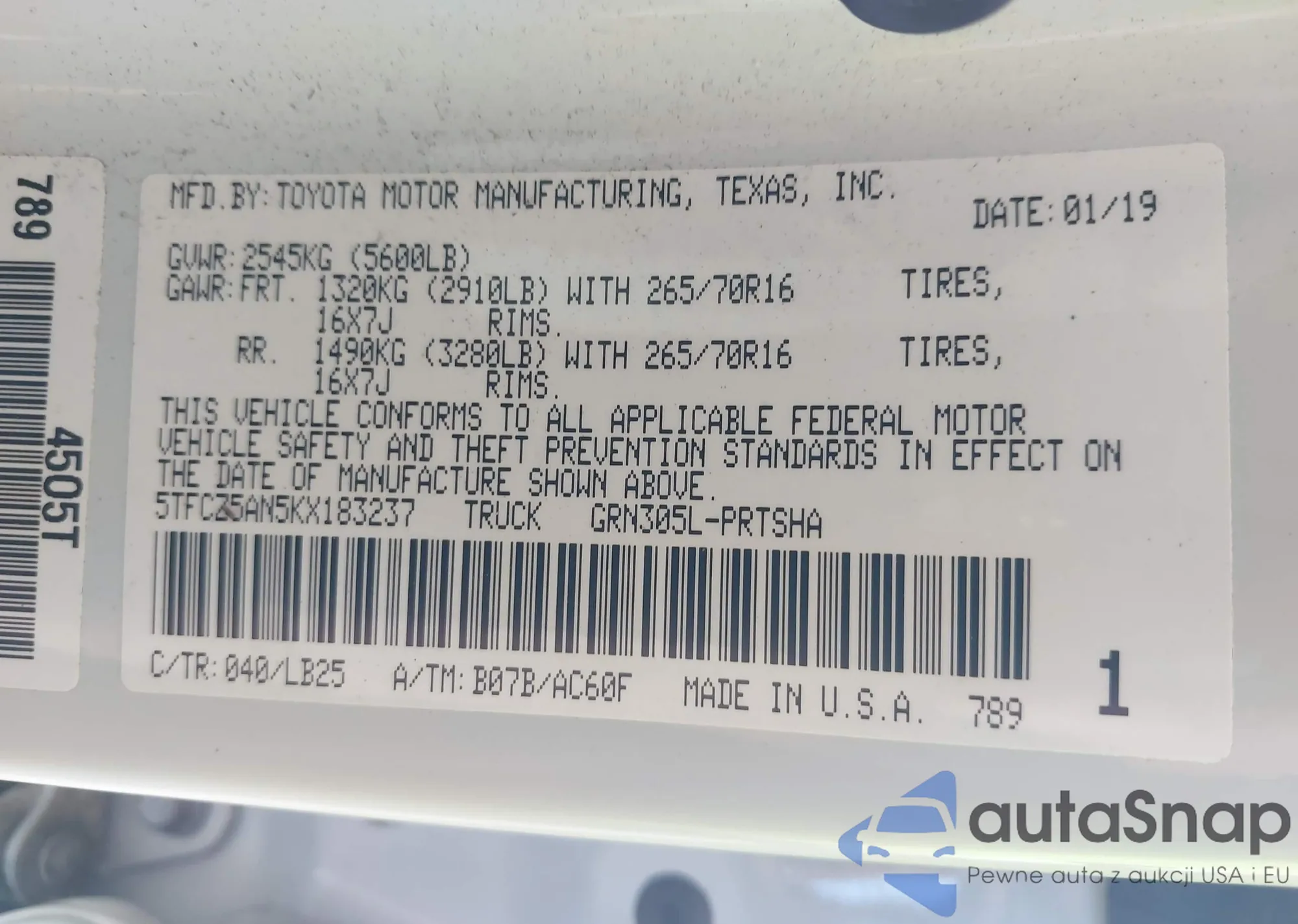 • VIN 5TFCZ5AN5KX183237