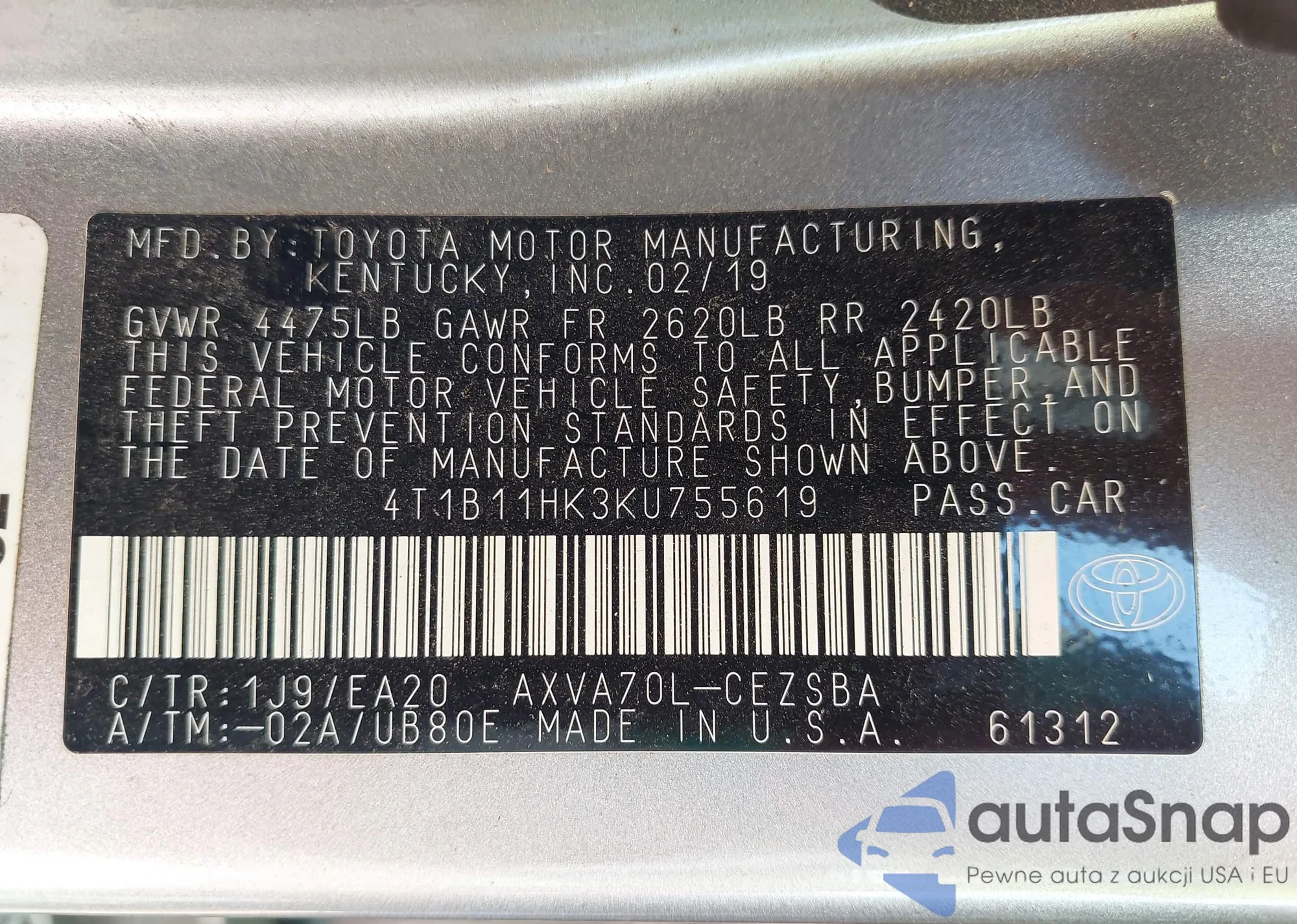 • VIN 4T1B11HK3KU755619