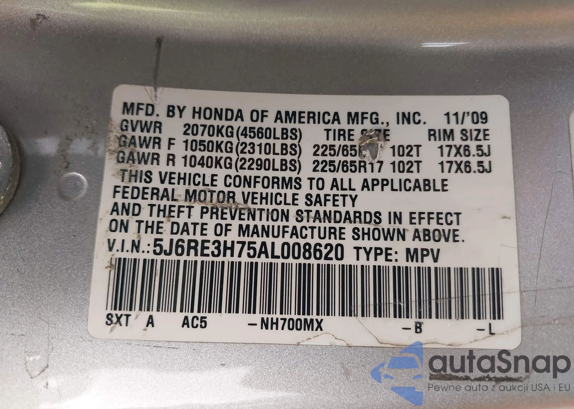 • VIN 5J6RE3H75AL008620