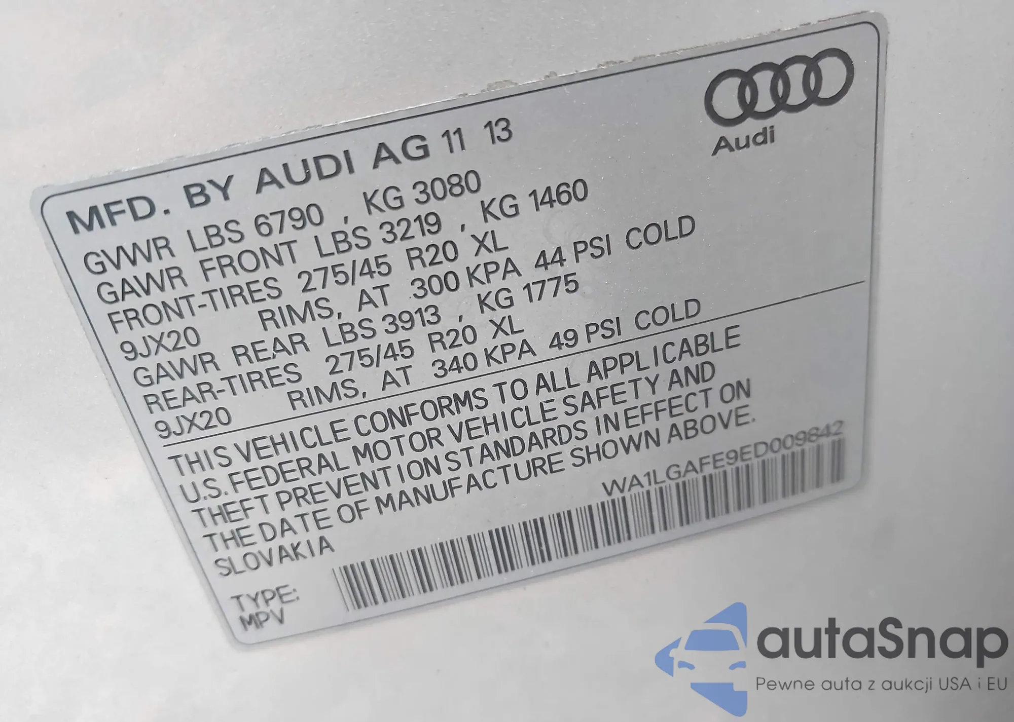 LOT: 43312529 VIN: WA1VXAF72MD011778