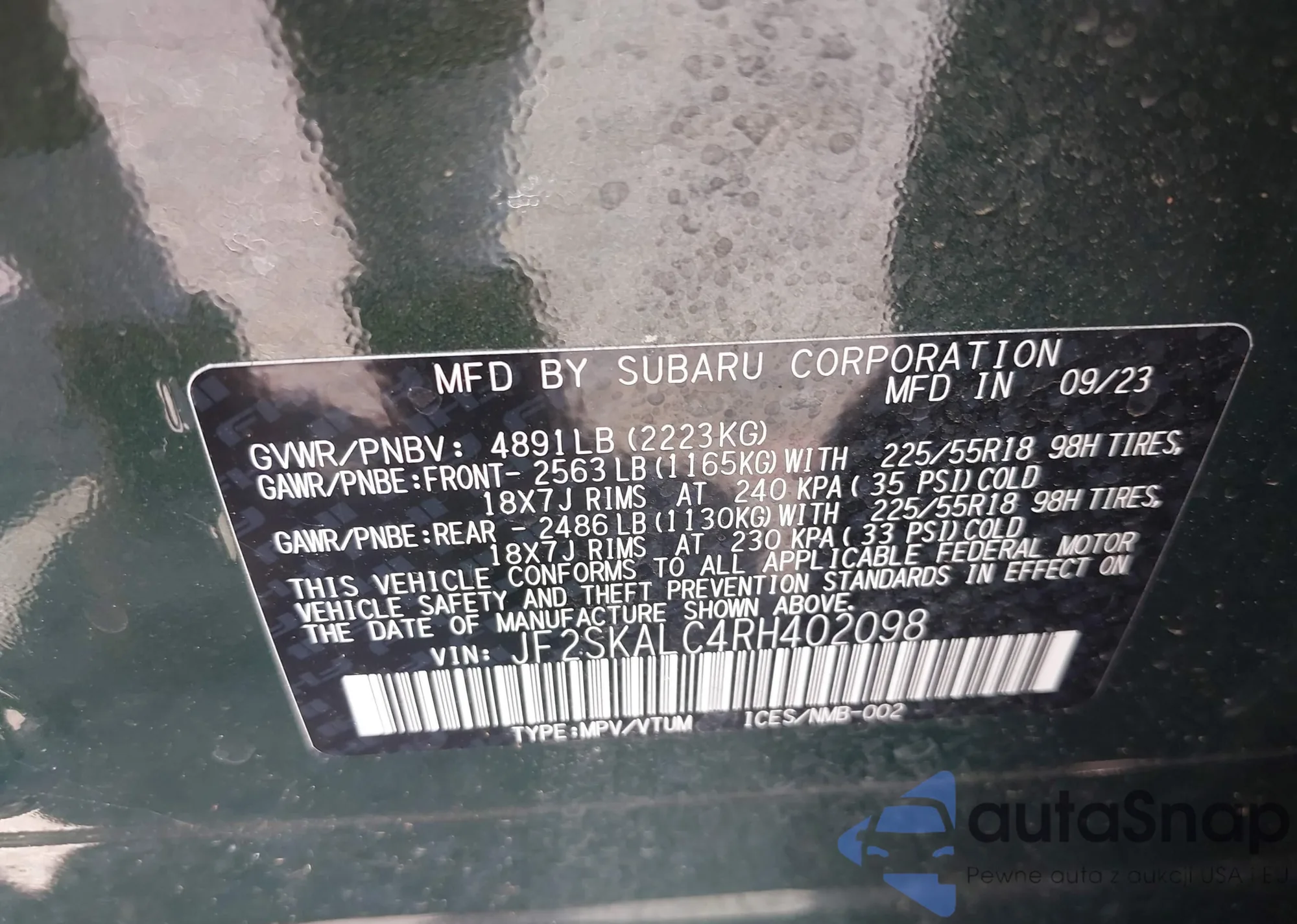 LOT: 39994157 VIN: JF2SKALC4RH402098