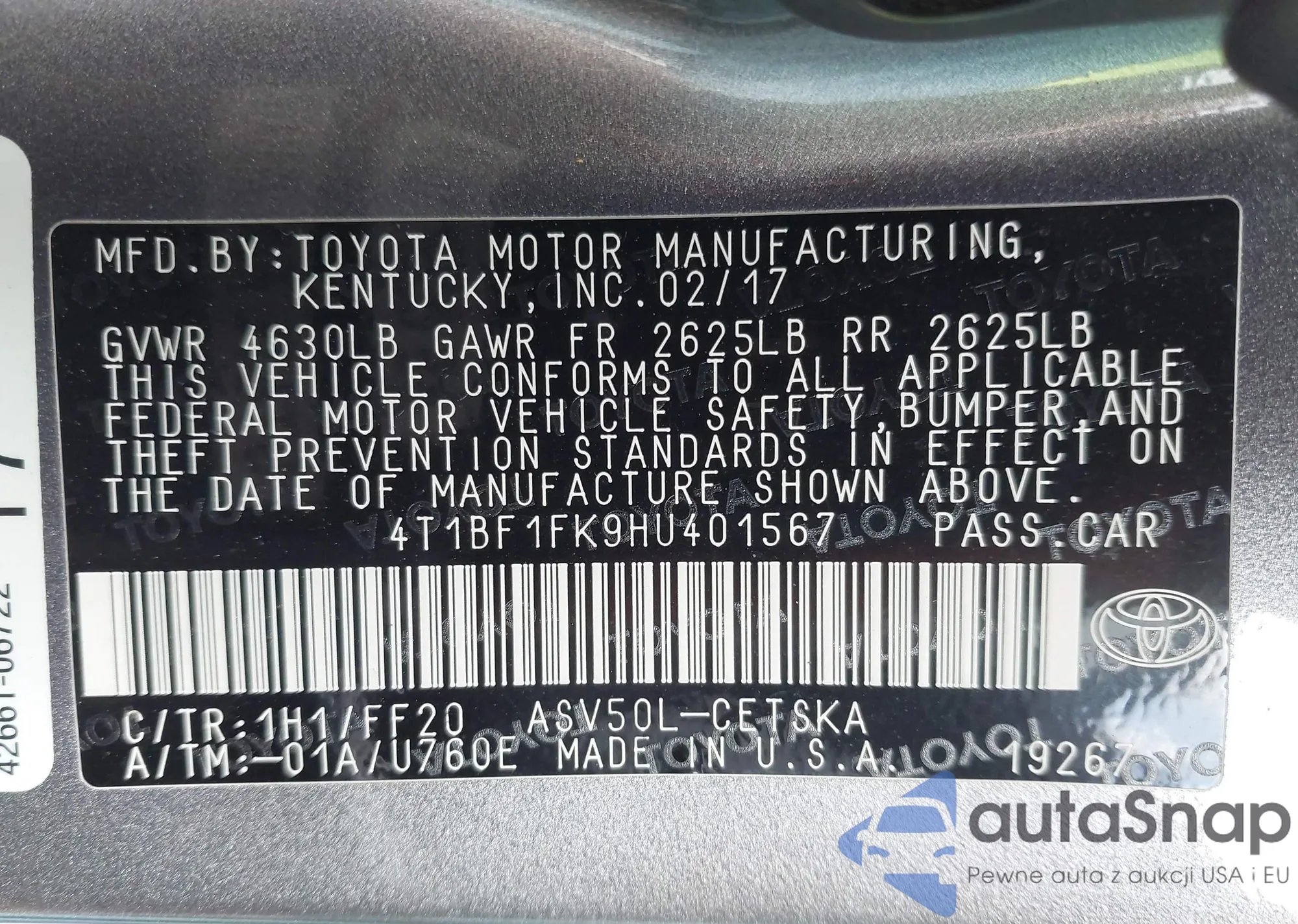 LOT: 43066119 VIN: 4T1BF1FK9HU401567