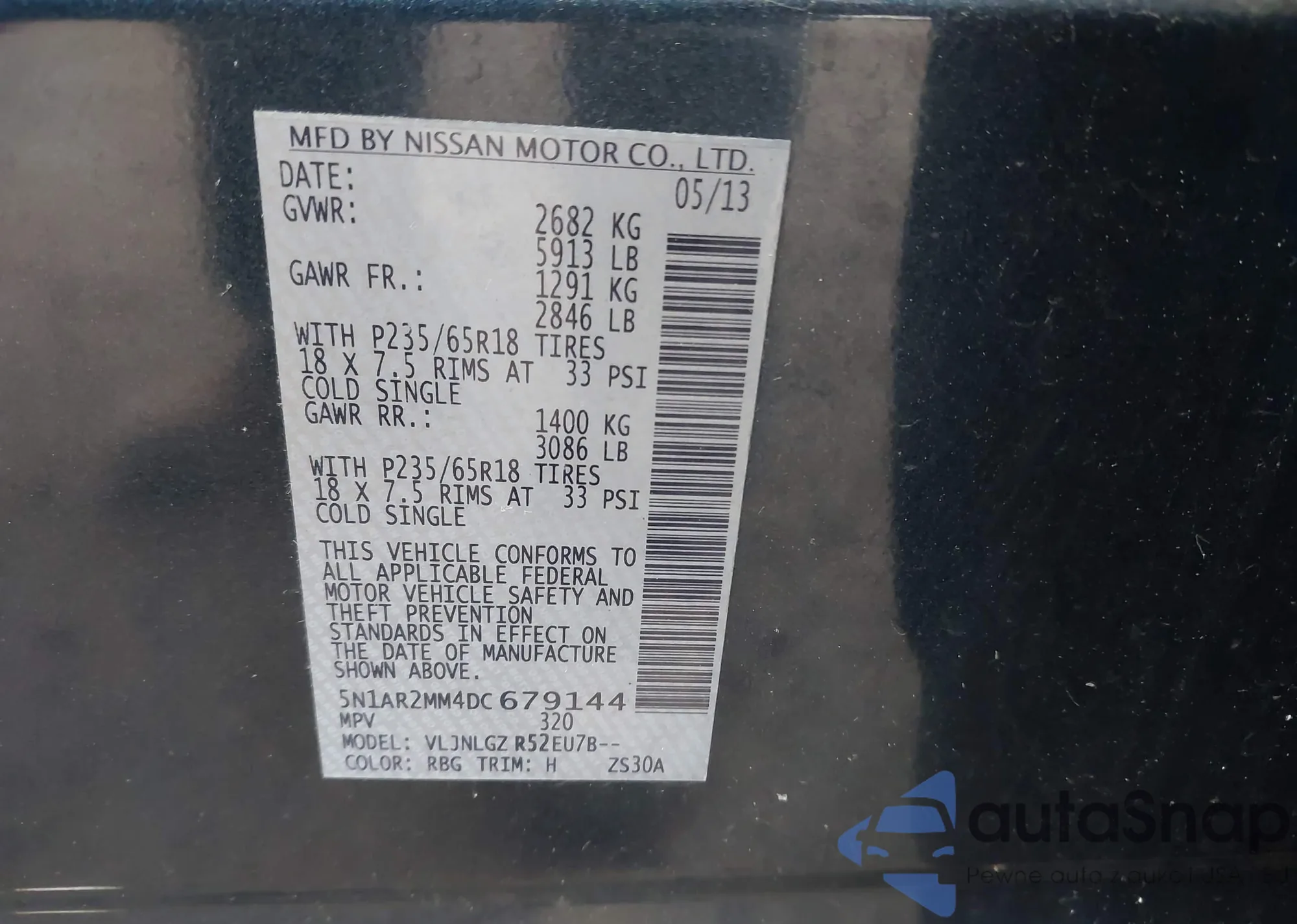 LOT: 43270746 VIN: 5N1AR2MM4DC679144