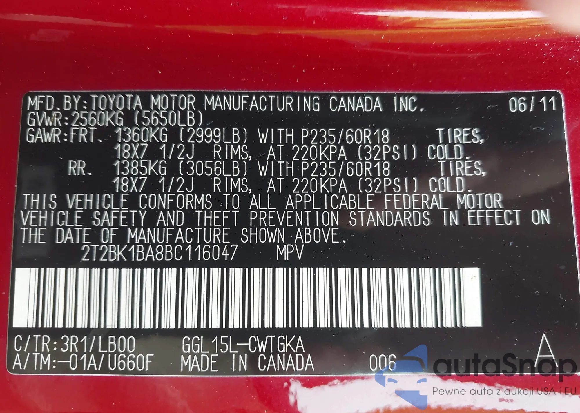 • VIN 2T2BK1BA8BC116047