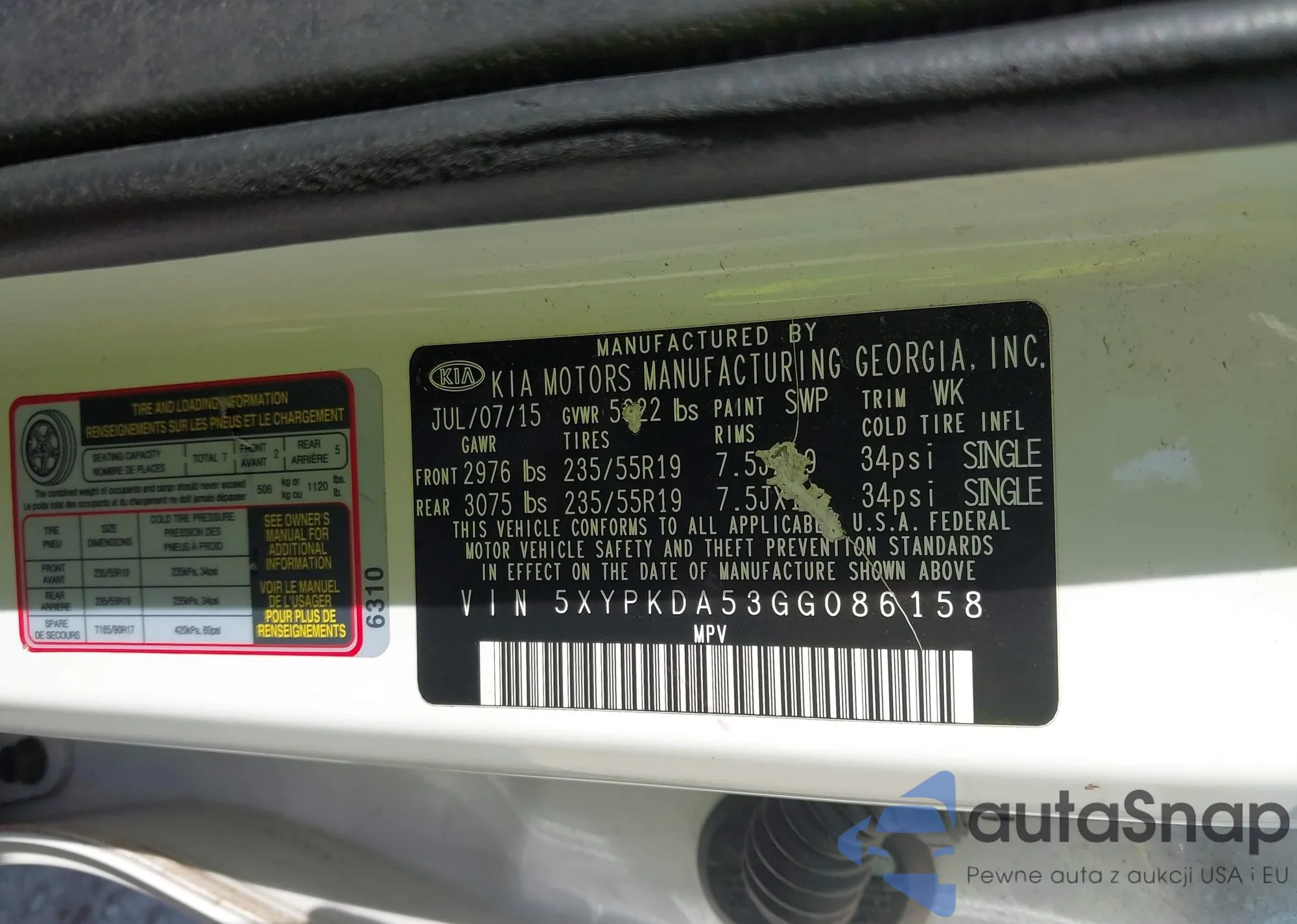 2016 Kia Sorento 3.3L Sxl z USA, uszkodzony, nr VIN 5XYPKDA53GG086158