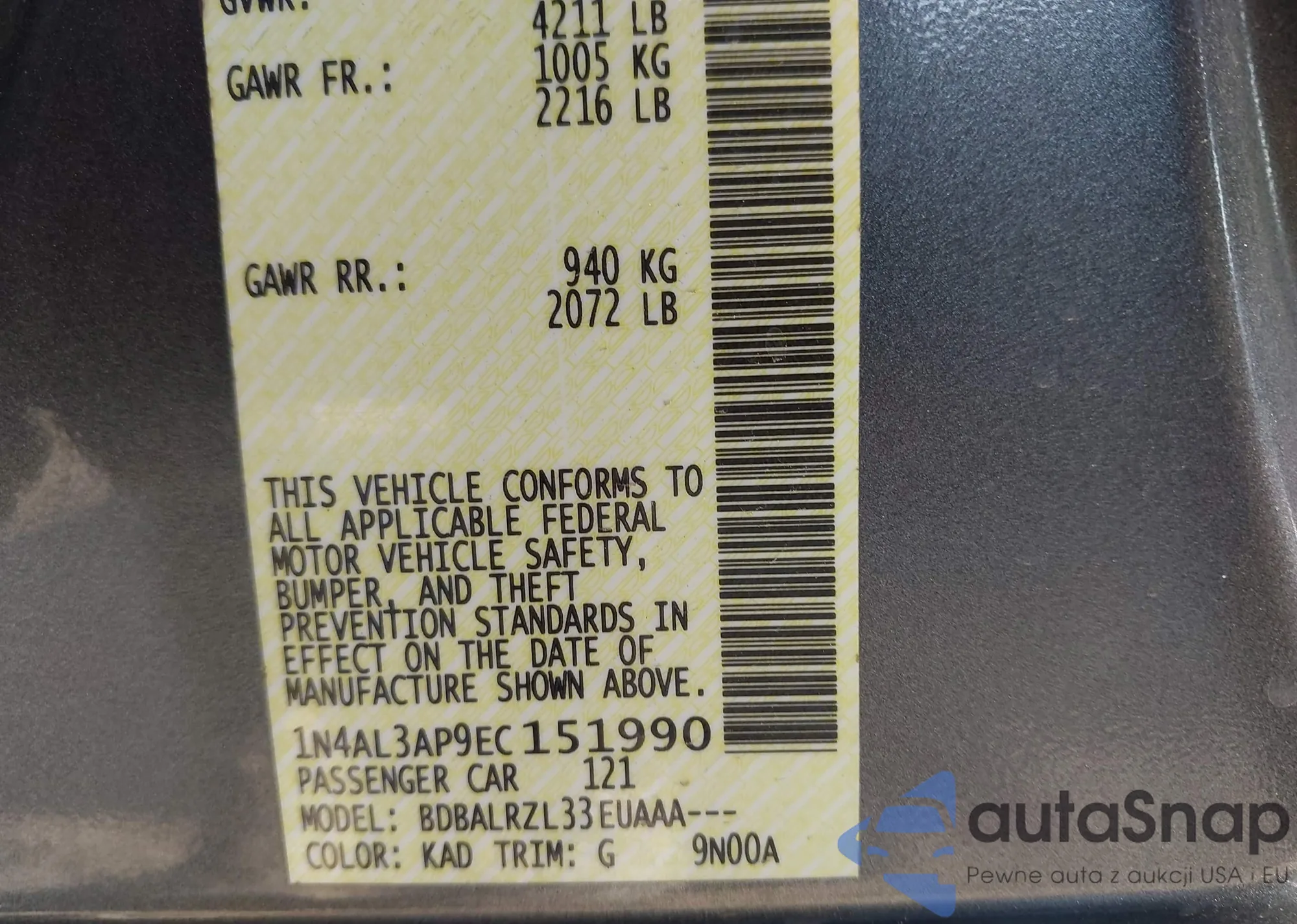 LOT: 43348851 VIN: 1N4AL3AP9EC151990