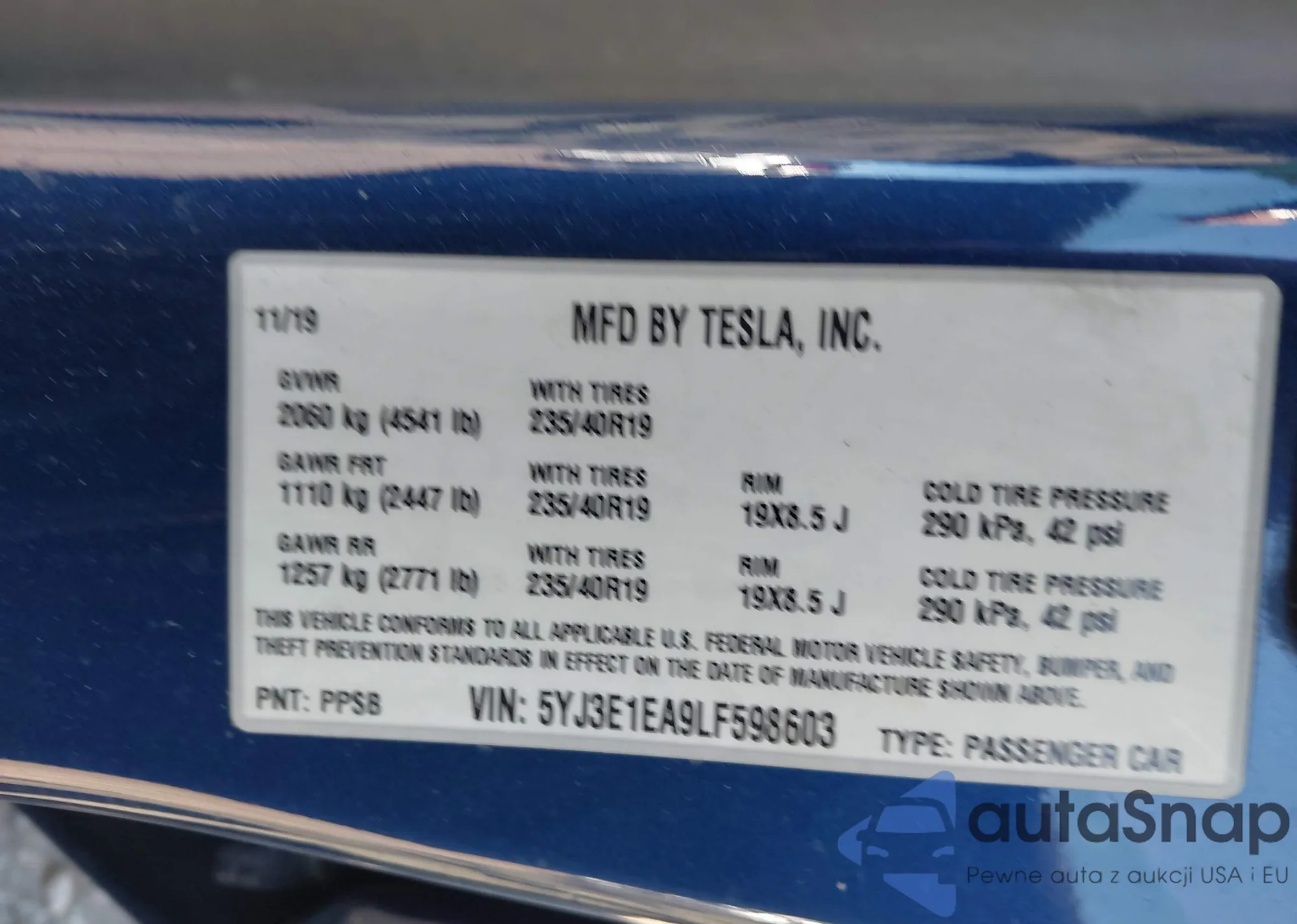 • VIN 5YJ3E1EA9LF598603