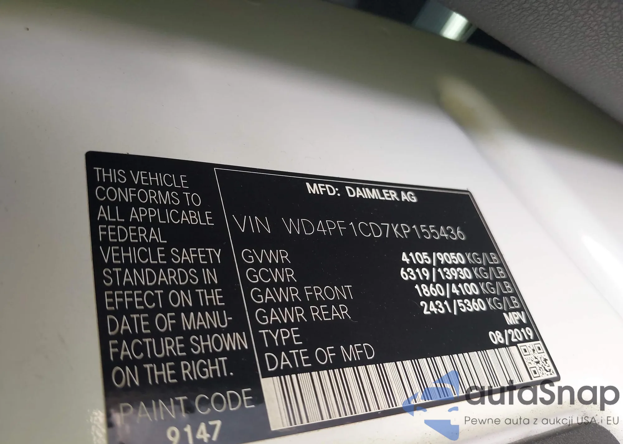 LOT: 43356739 VIN: WD4PF1CD7KP155436