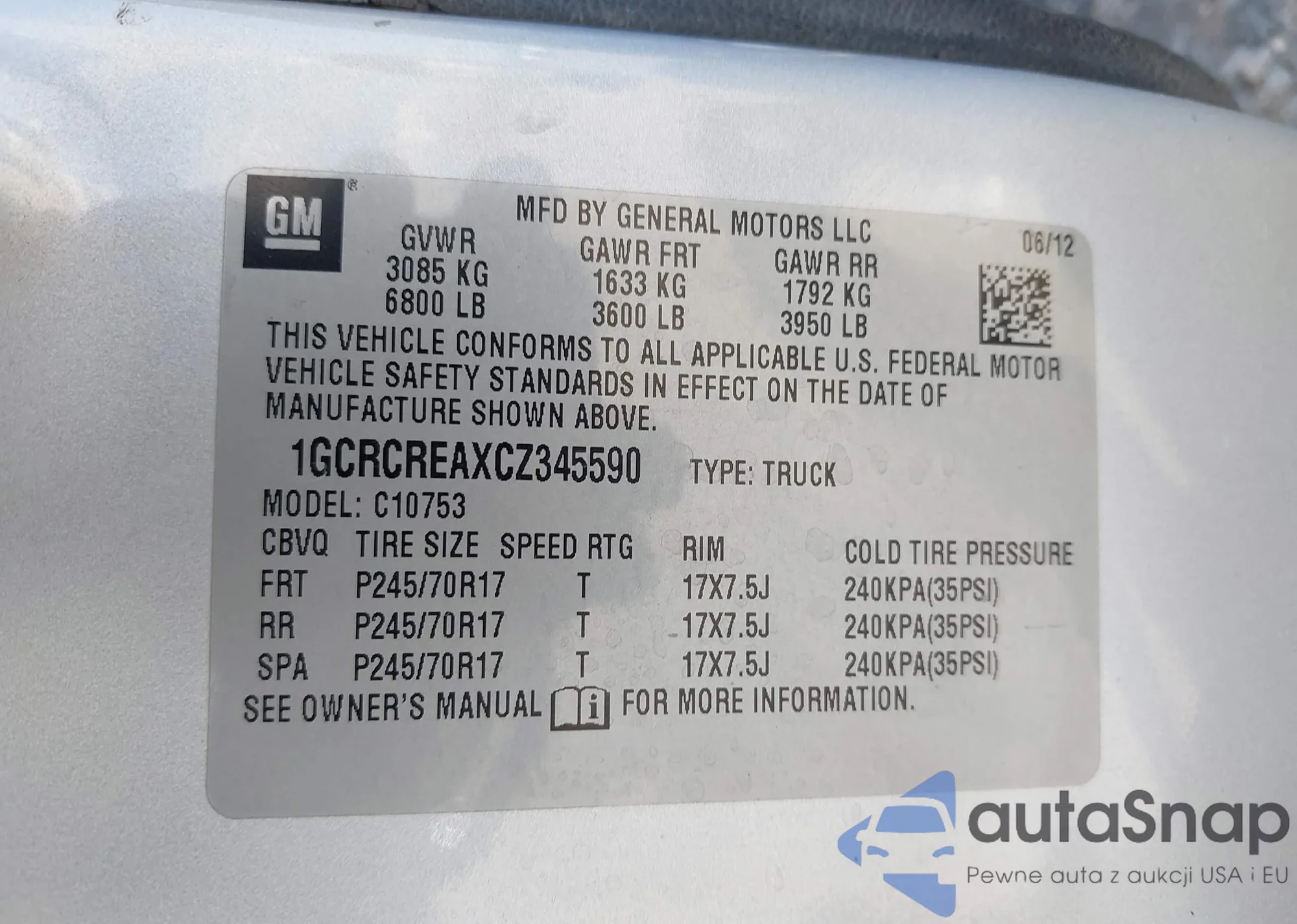 LOT: 43371066 VIN: 1GCRCREAXCZ345590