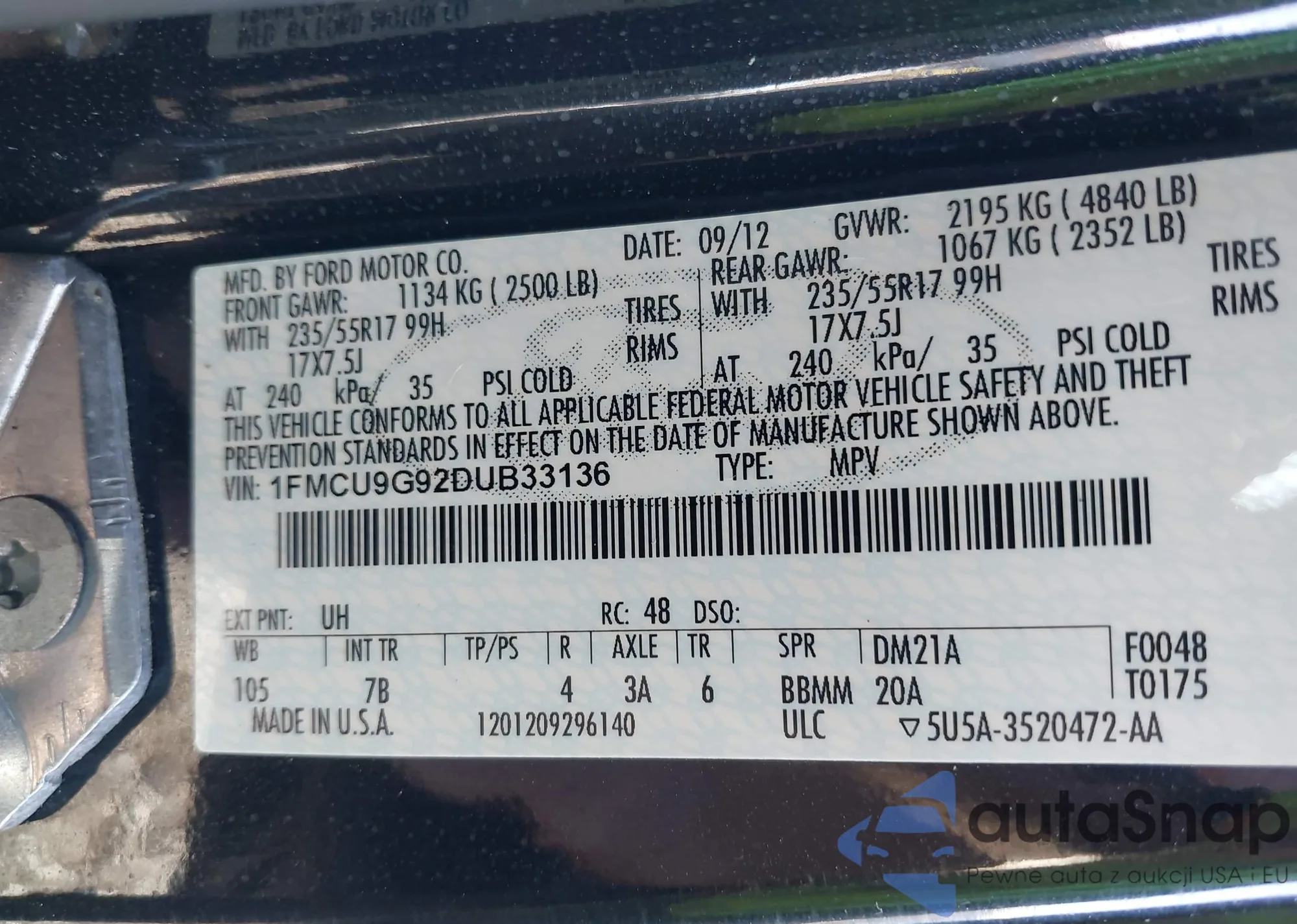 LOT: 43207649 VIN: 1FMCU9G92DUB33136