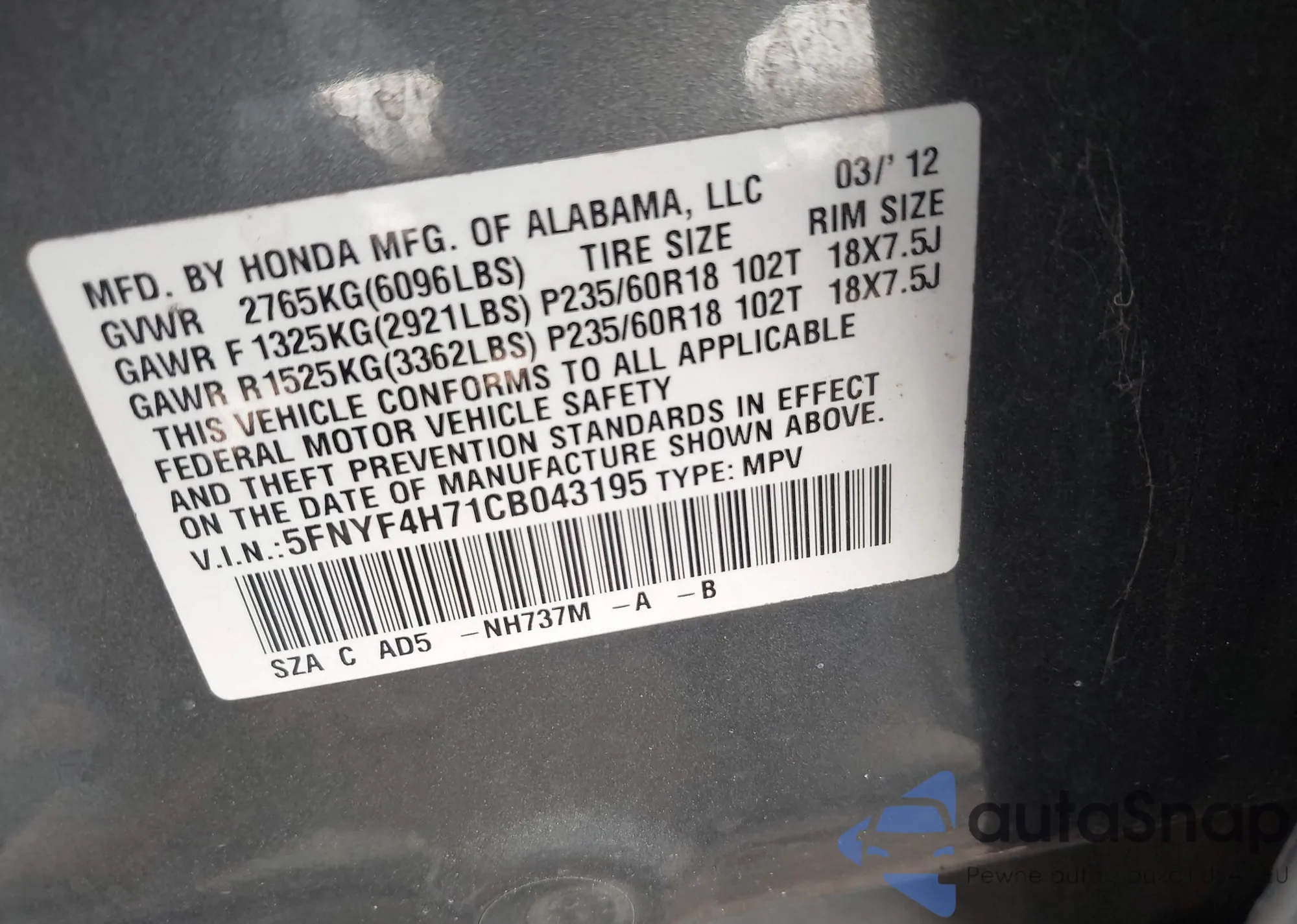 • VIN 5FNYF4H71CB043195