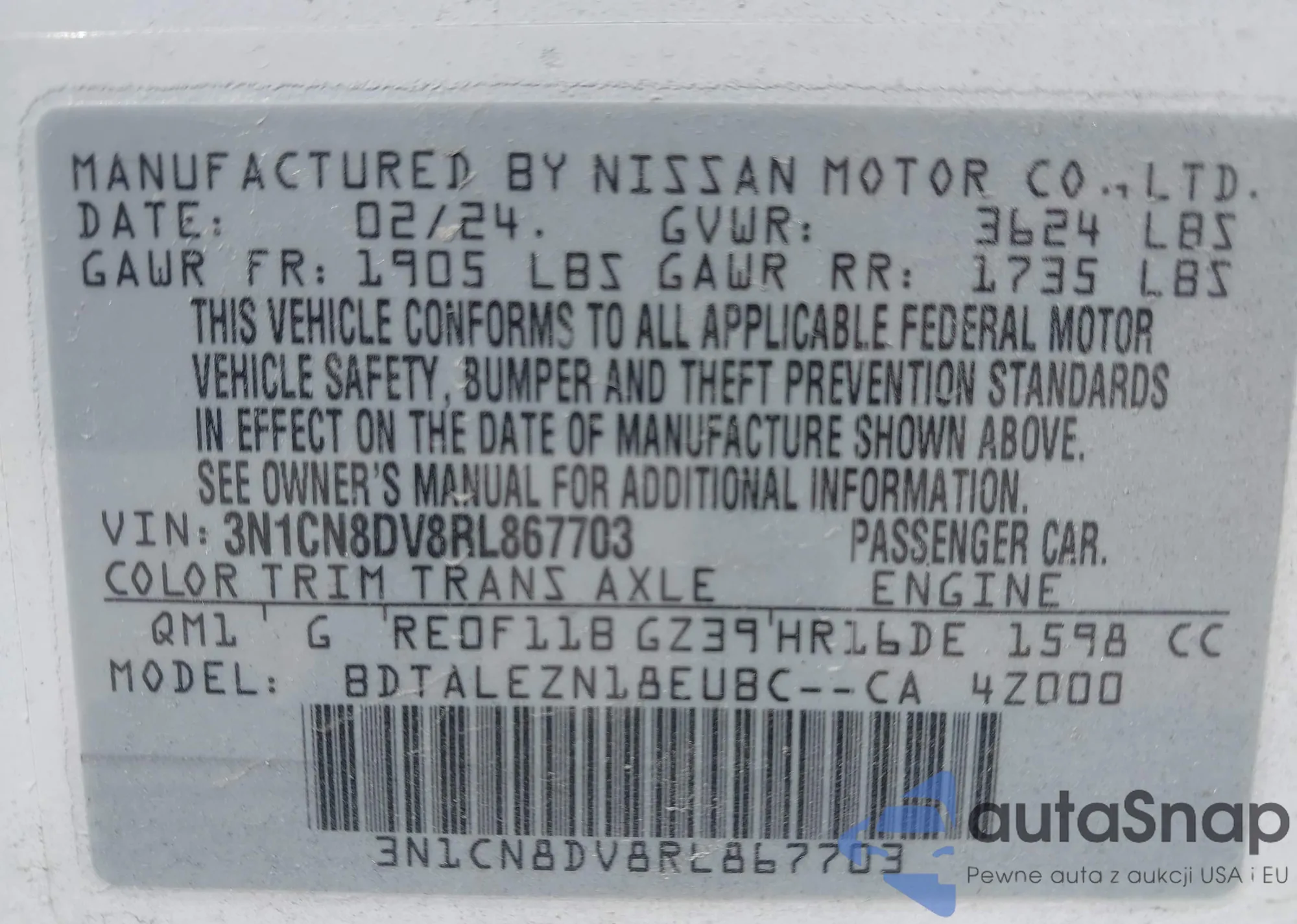 • VIN 3N1CN8DV8RL867703