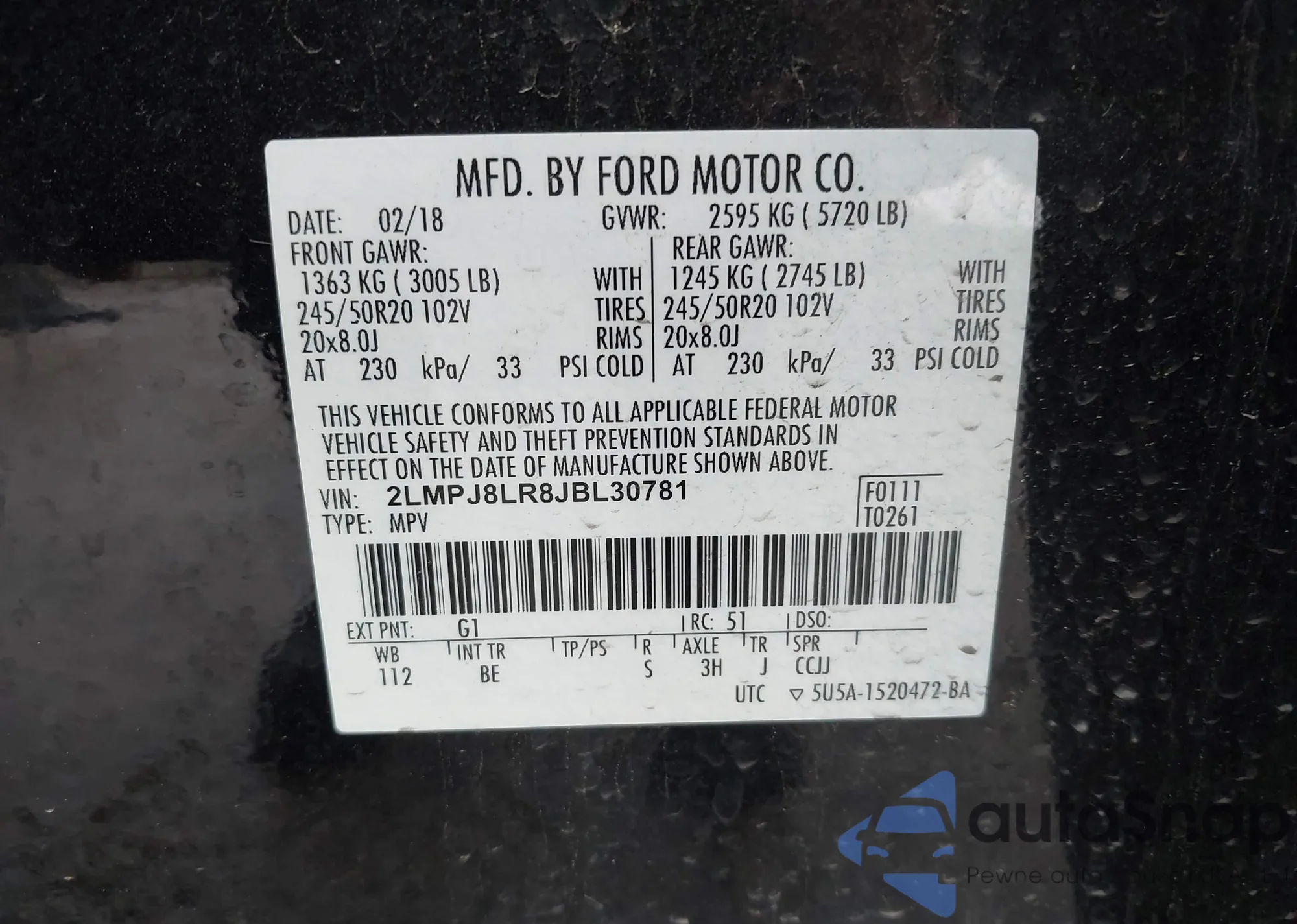 LOT: 42981979 VIN: 2LMPJ8LR8JBL30781