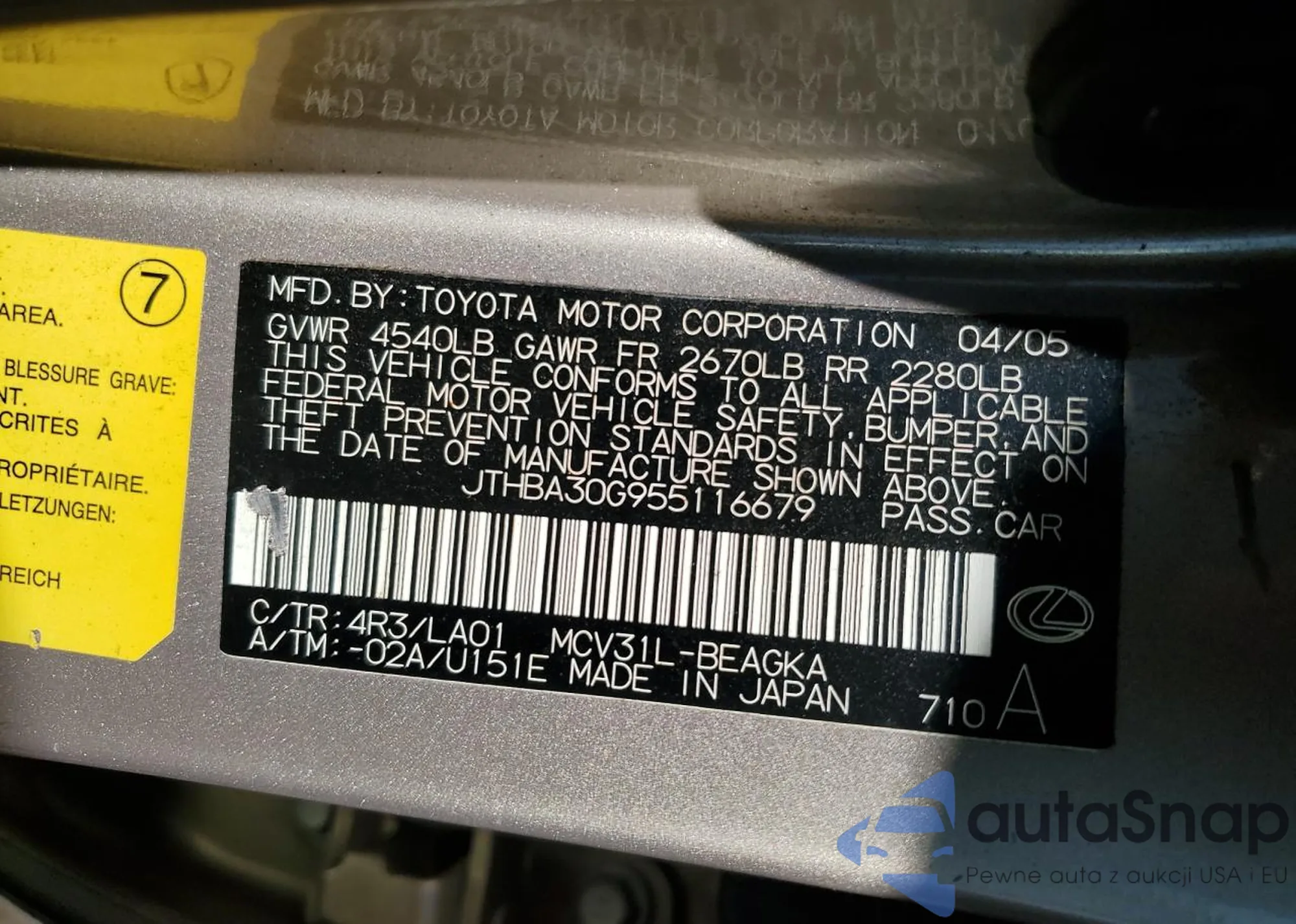 LOT: 82161075 VIN: JTHBA30G955116679