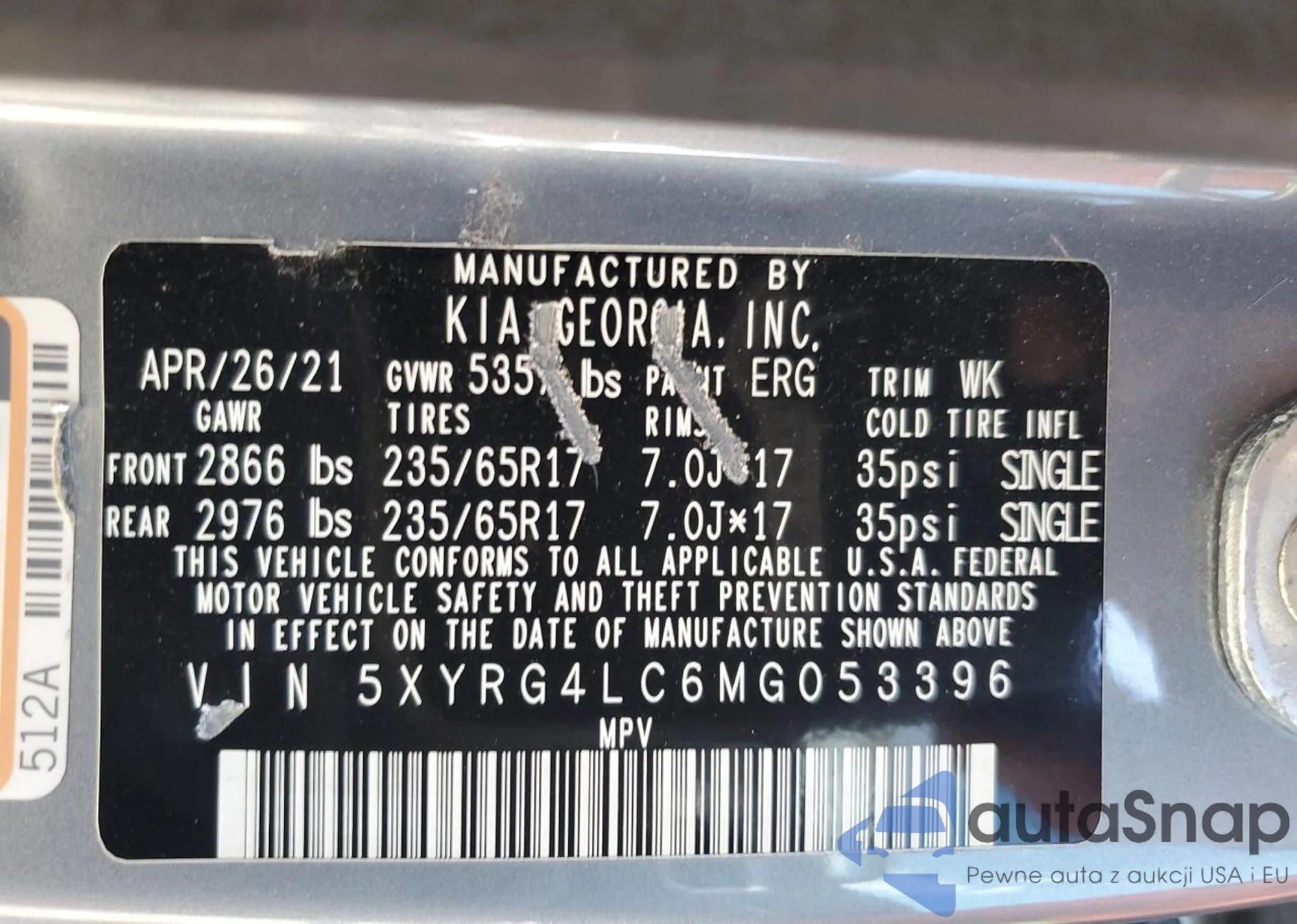 • VIN 5XYRG4LC6MG053396