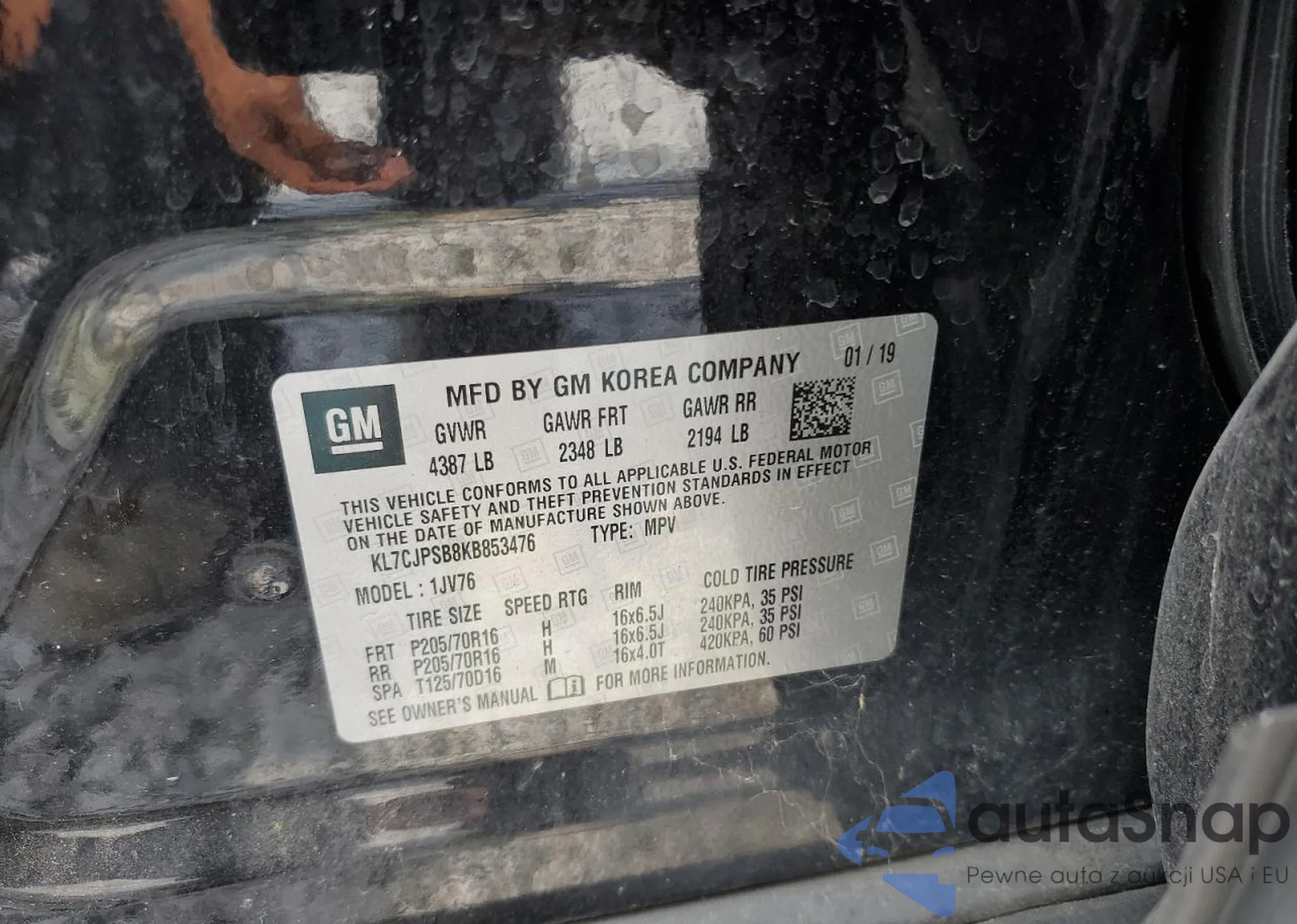 • VIN KL7CJPSB8KB853476