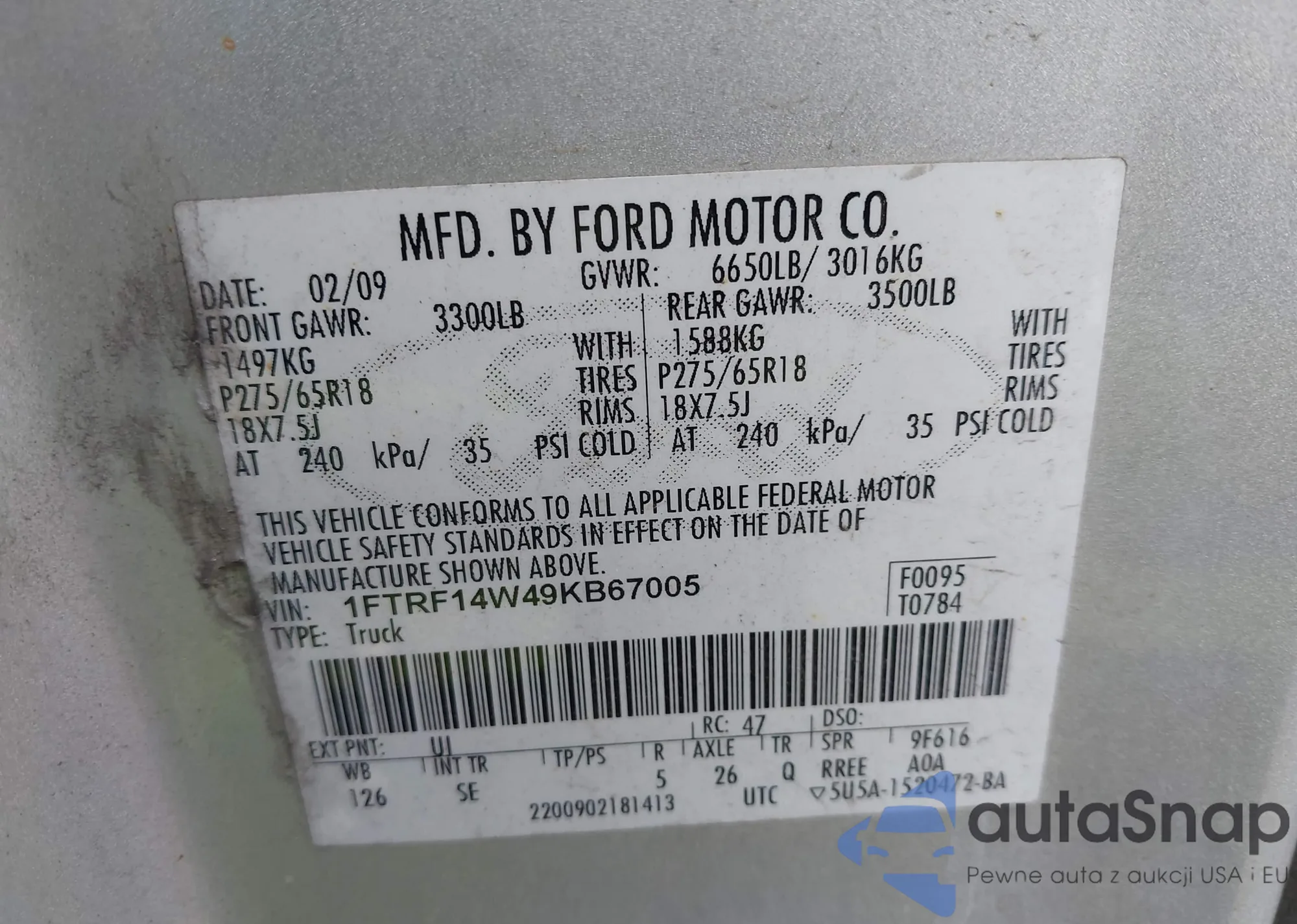 LOT: 43568212 VIN: 1FTRF14W49KB67005
