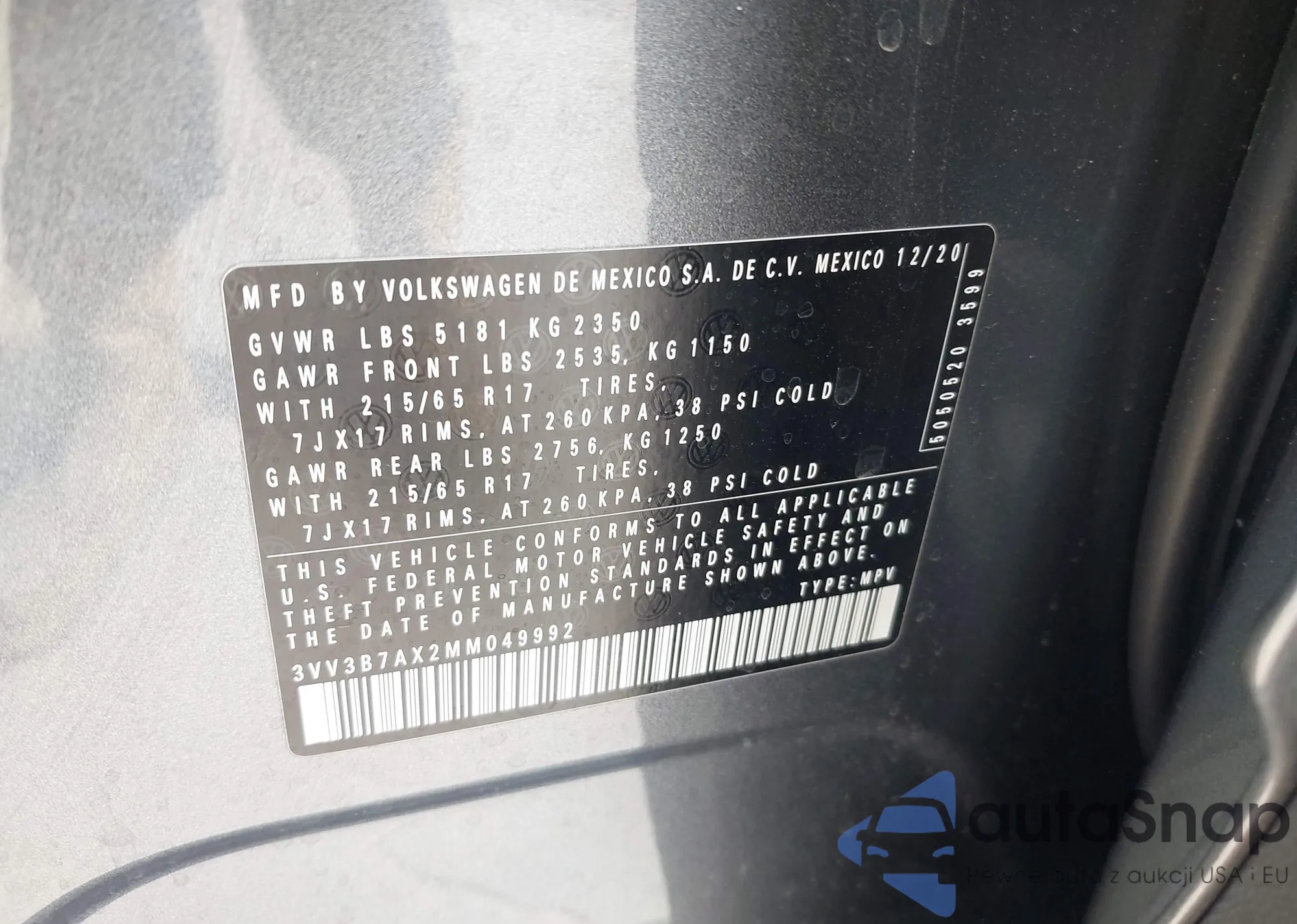 LOT: 43277391 VIN: 3VV3B7AX2MM049992