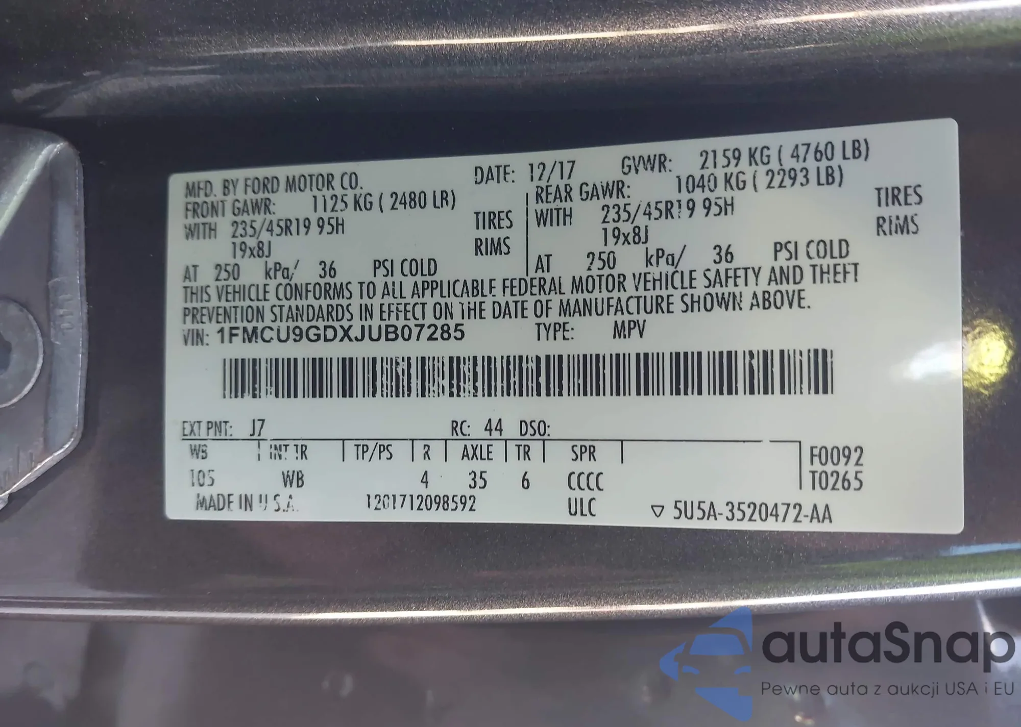 • VIN 1FMCU9GDXJUB07285