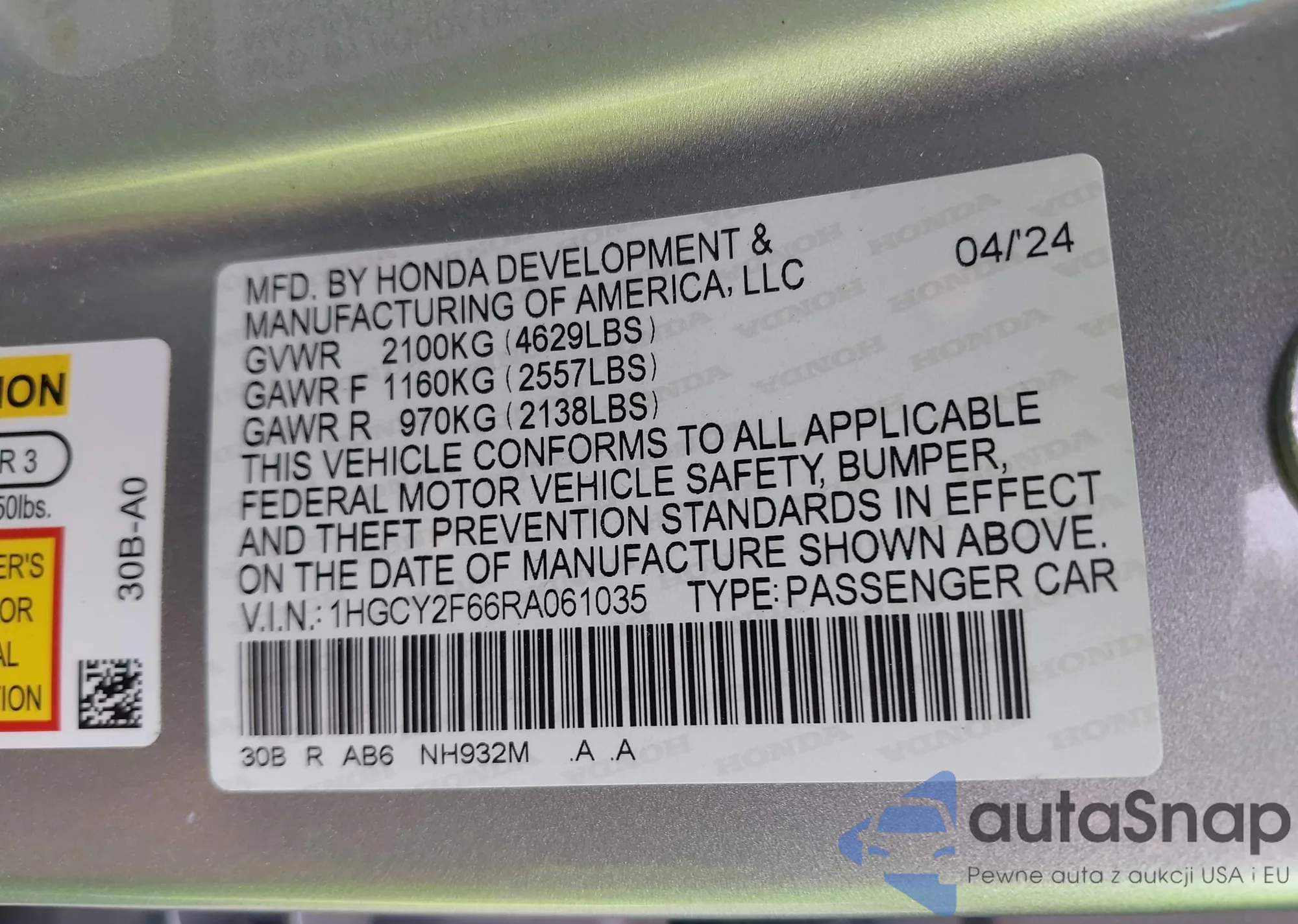 LOT: 43393810 VIN: 1HGCY2F66RA061035