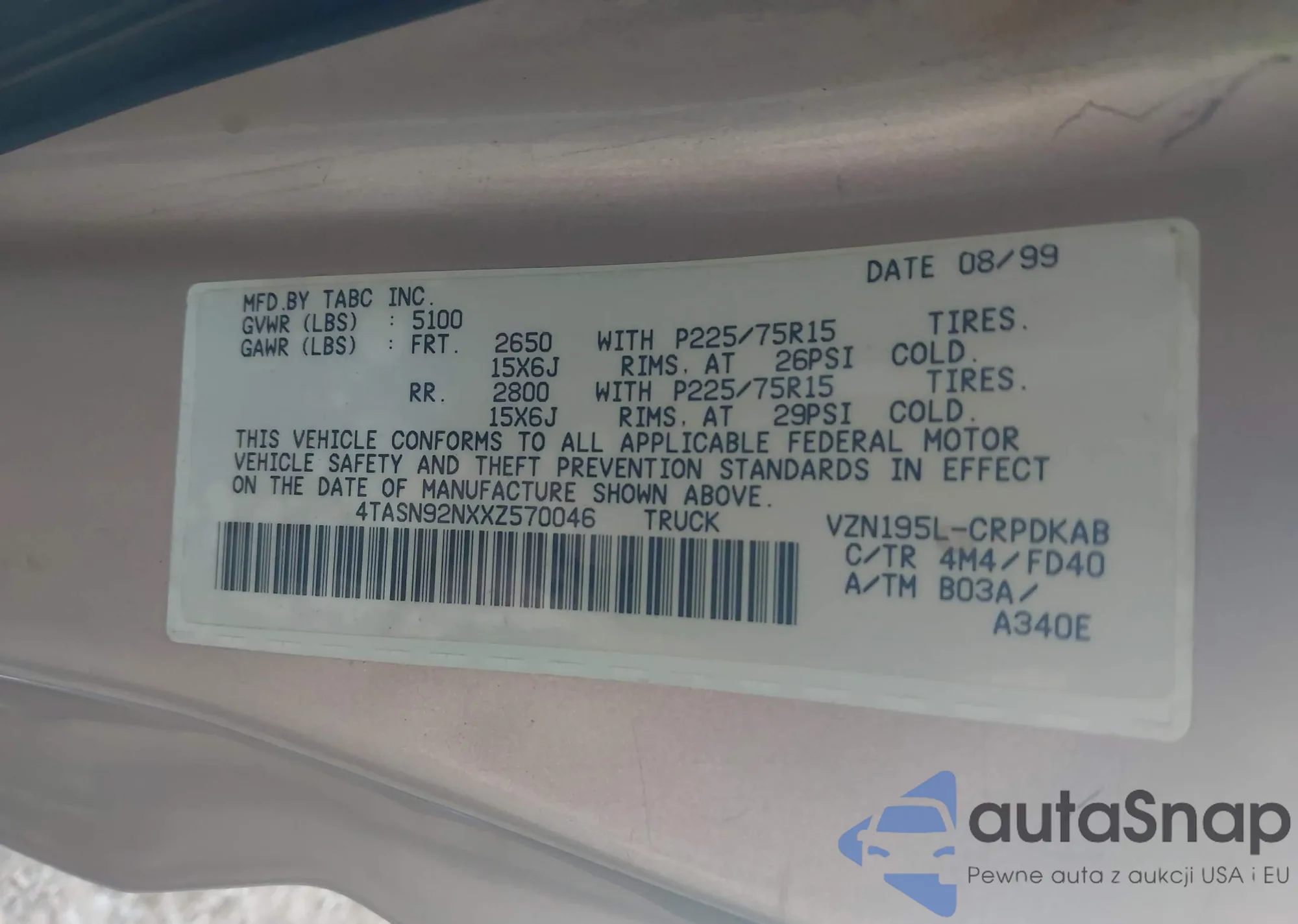 • VIN 4TASN92NXXZ570046