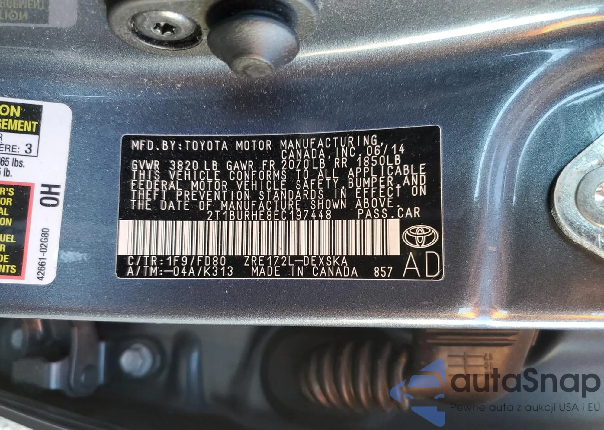 LOT: 84927945 VIN: 2T1BURHE8EC197448