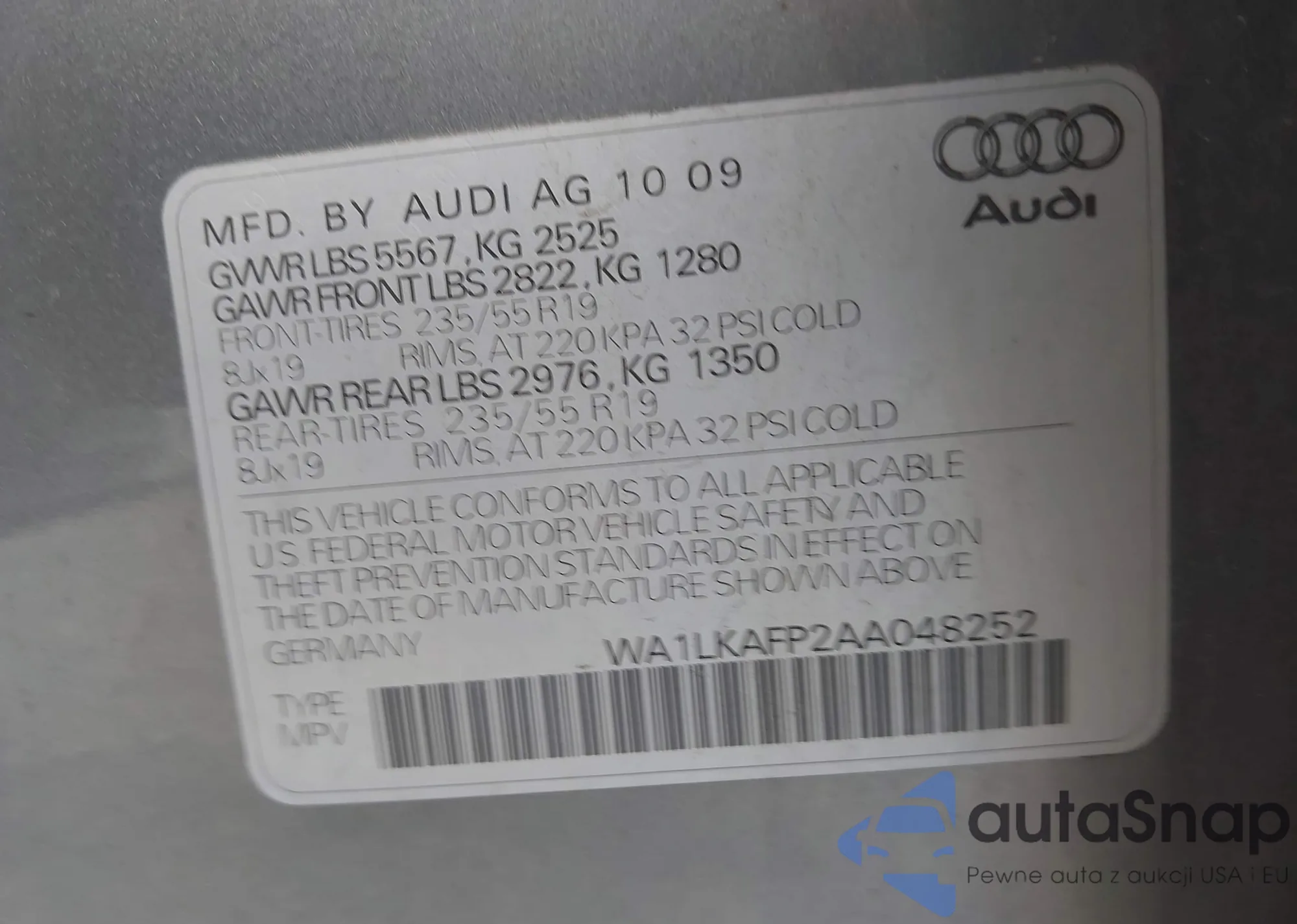 LOT: 43407474 VIN: WA1LKAFP2AA048252