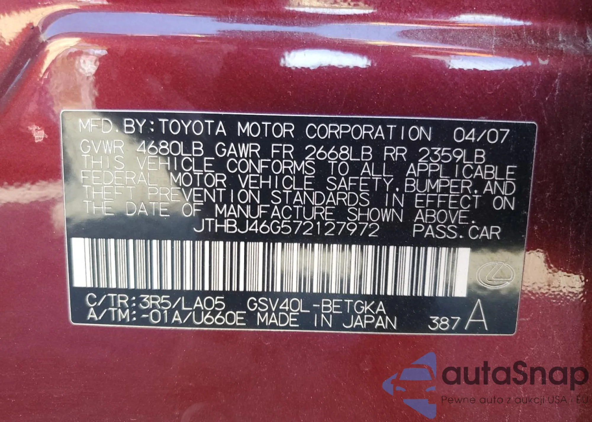 LOT: 87456595 VIN: JTHBJ46G572127972