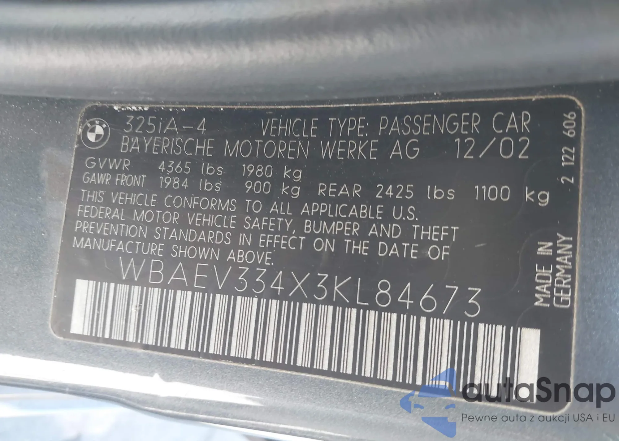 2003 BMW 3-Series z USA, uszkodzony, nr VIN WBAEV334X3JL84673