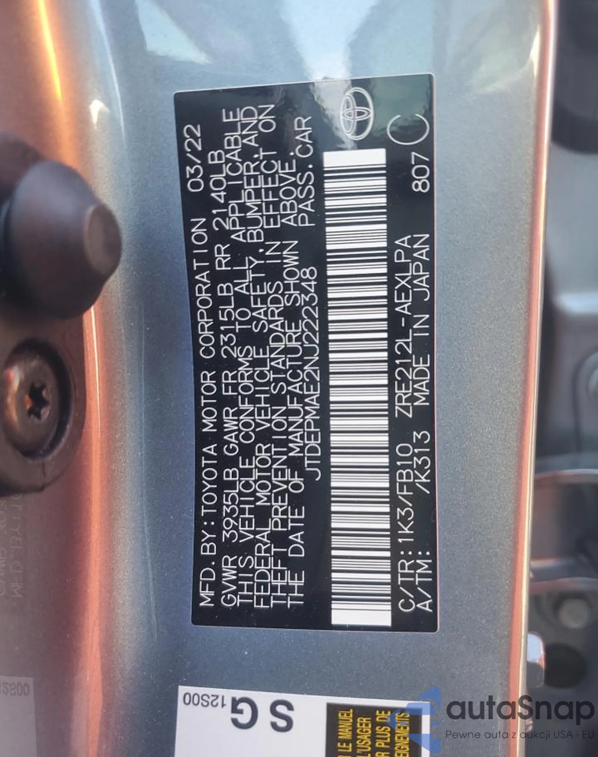 LOT: 87013215 VIN: JTDEPMAE2NJ222348