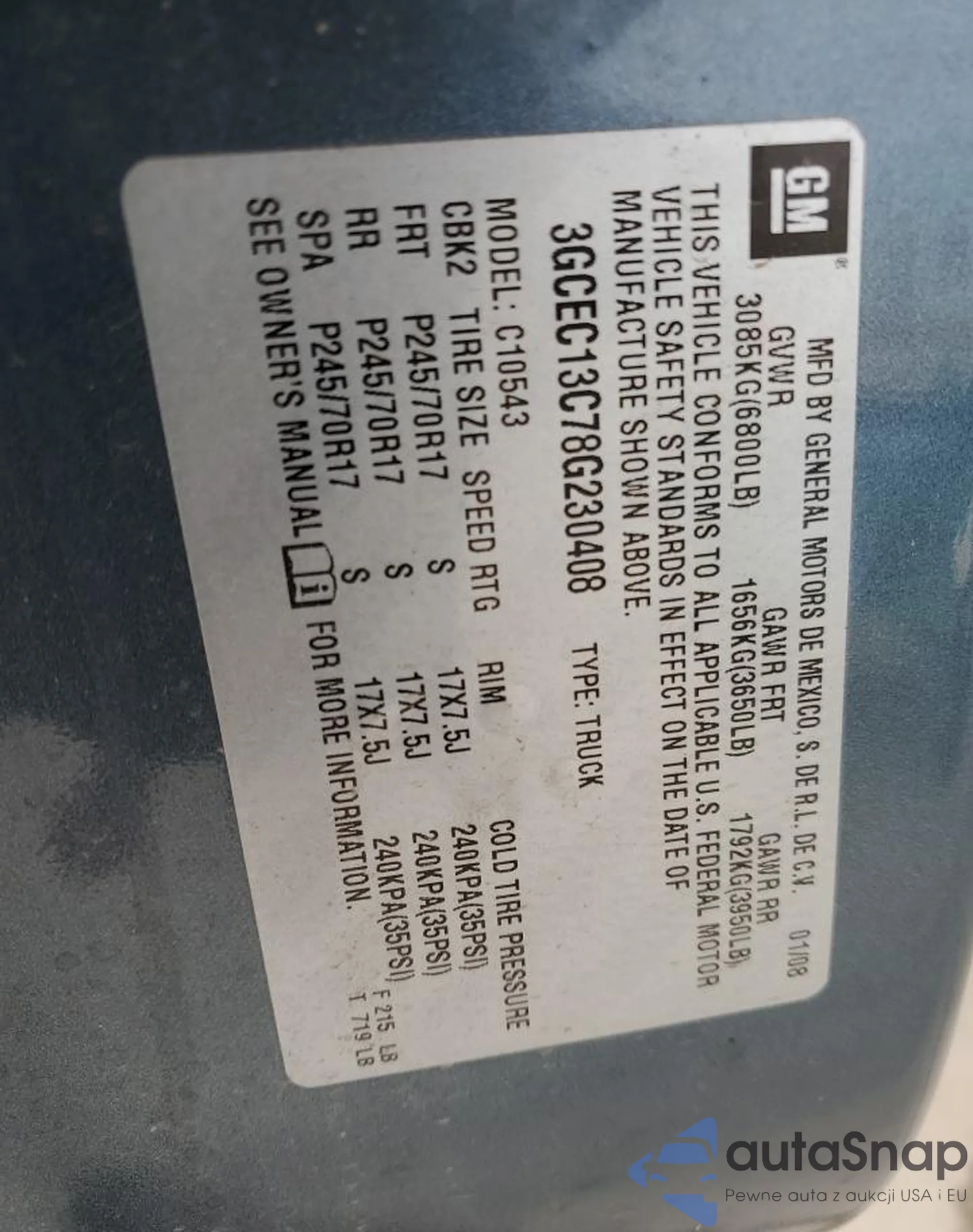 • VIN 3GCEC13C78G230408