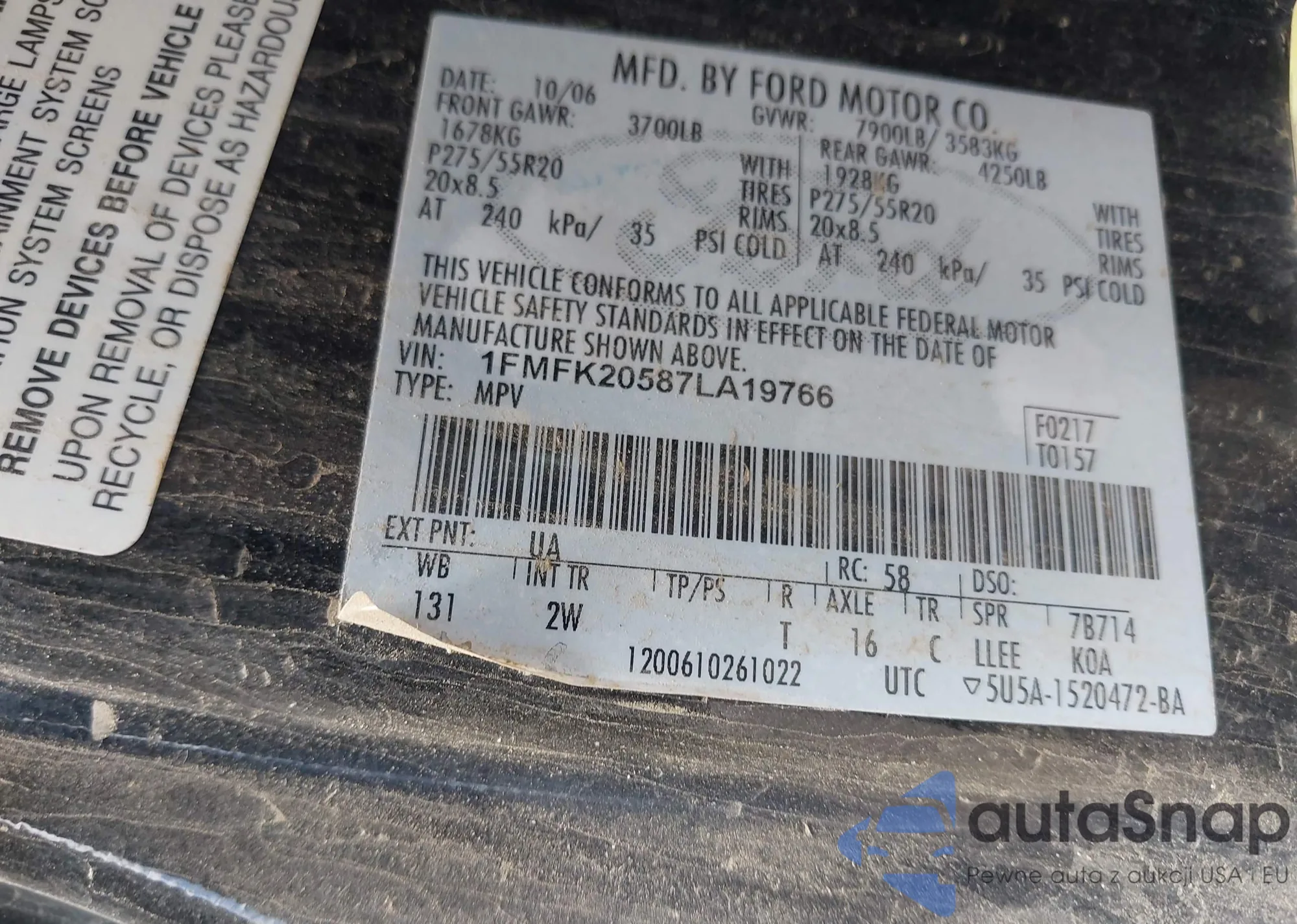 LOT: 42735434 VIN: 1FMFK20587LA19766