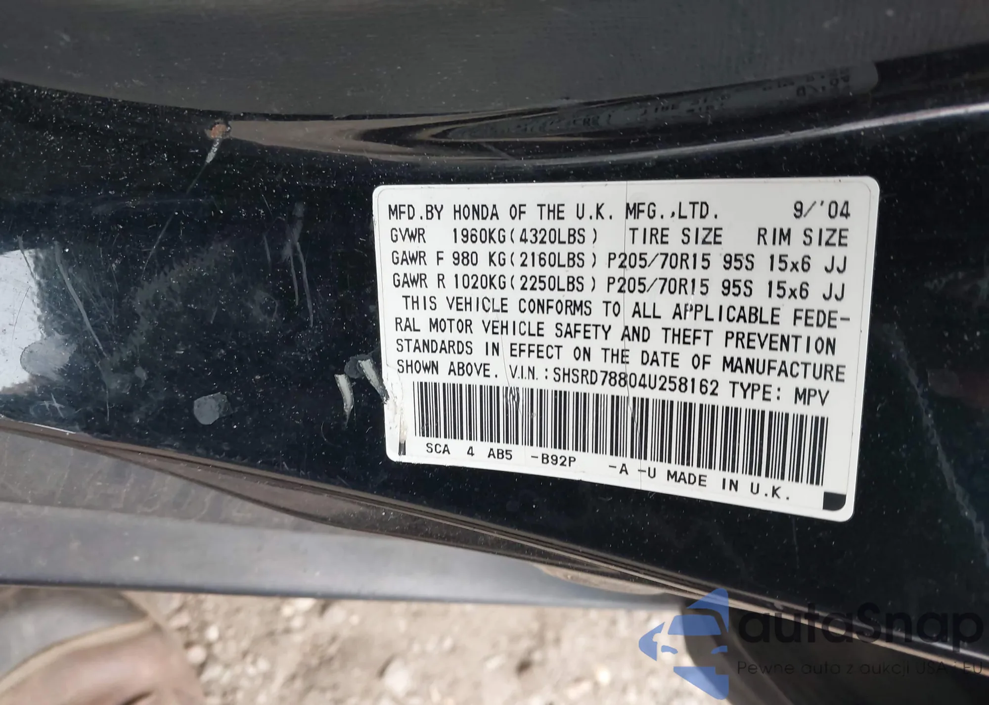 LOT: 43170337 VIN: 5J6YH18395L010848