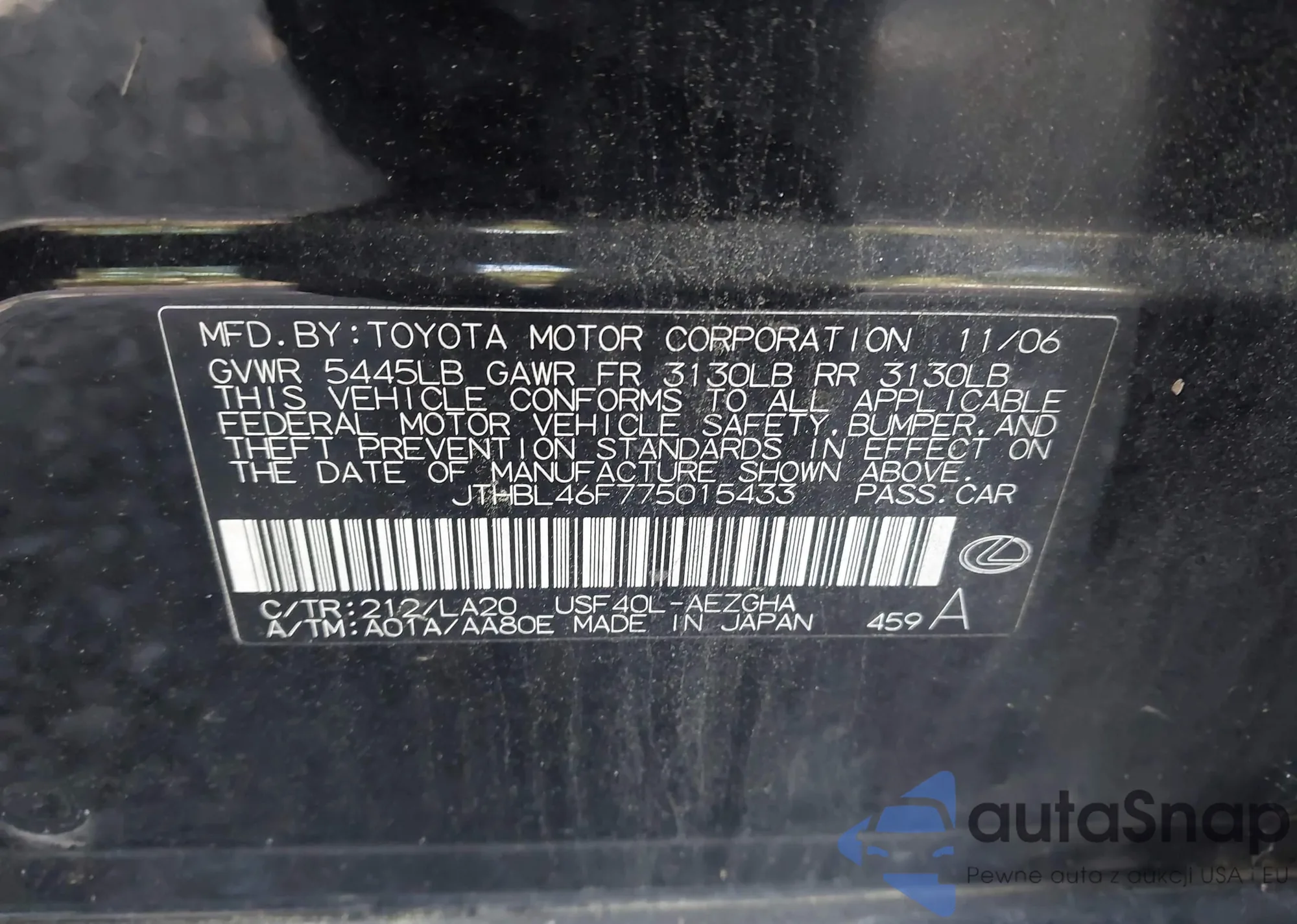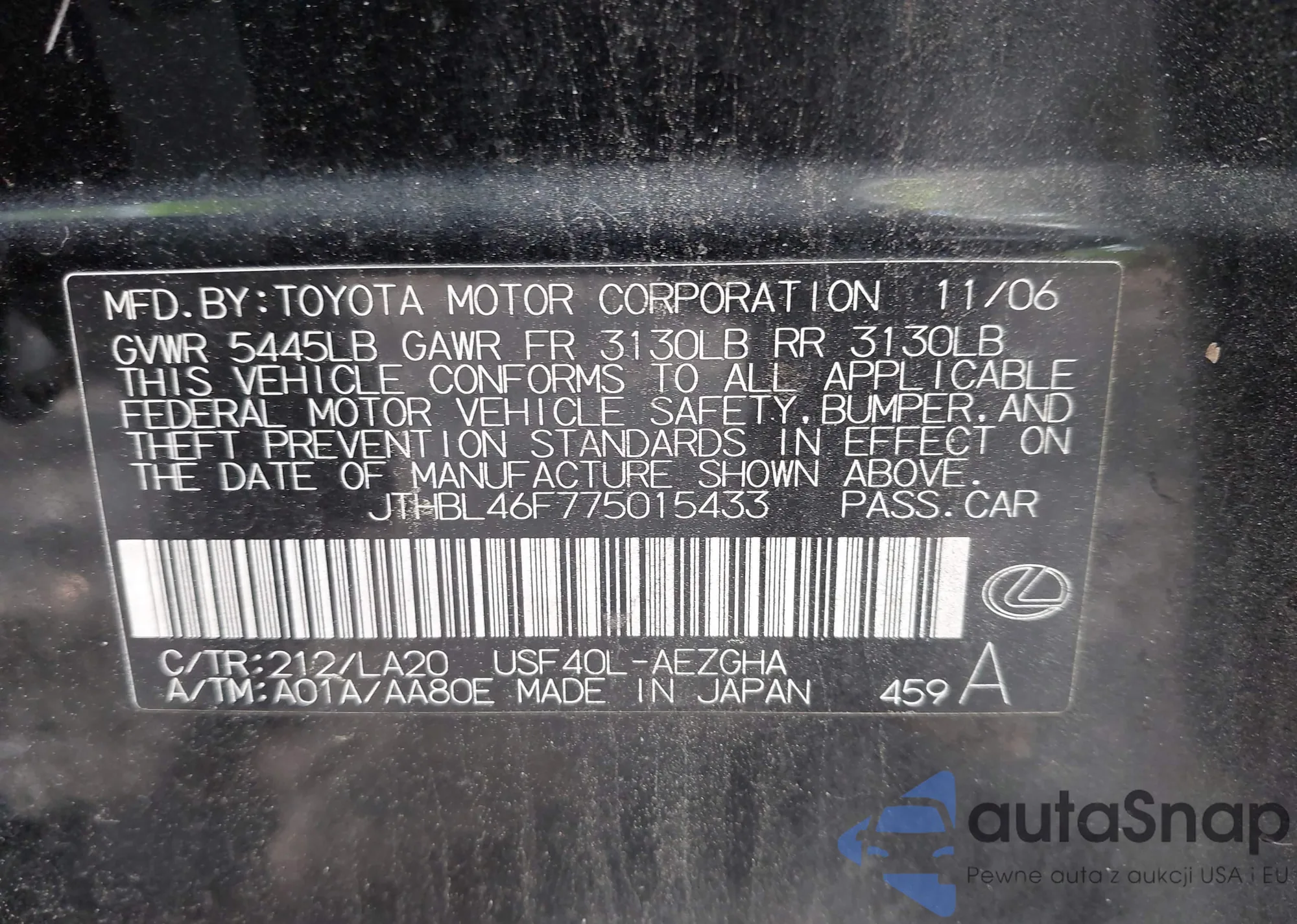 LOT: 43323044 VIN: JTHBL46F775015433