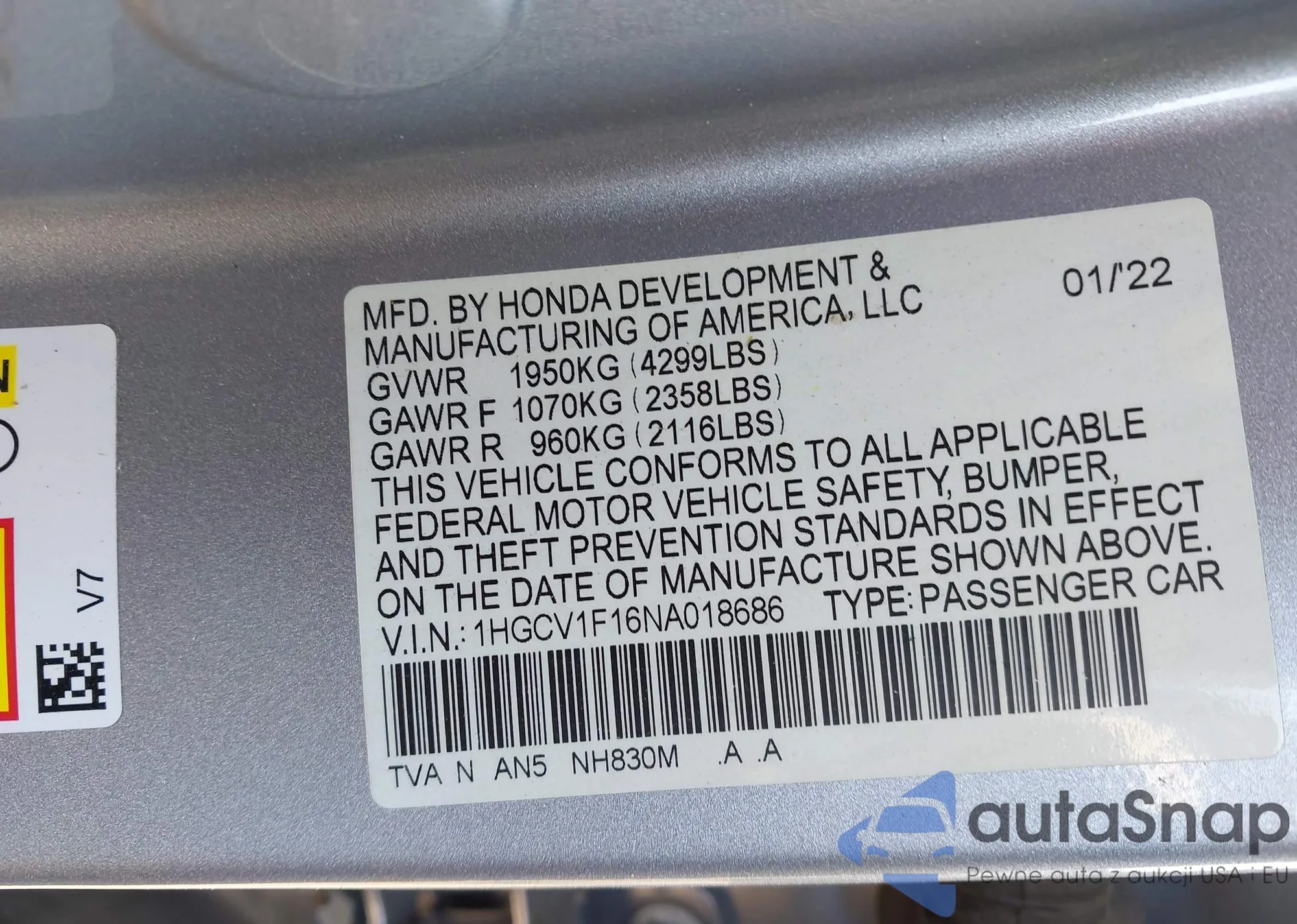 • VIN 1HGCV1F16NA018686