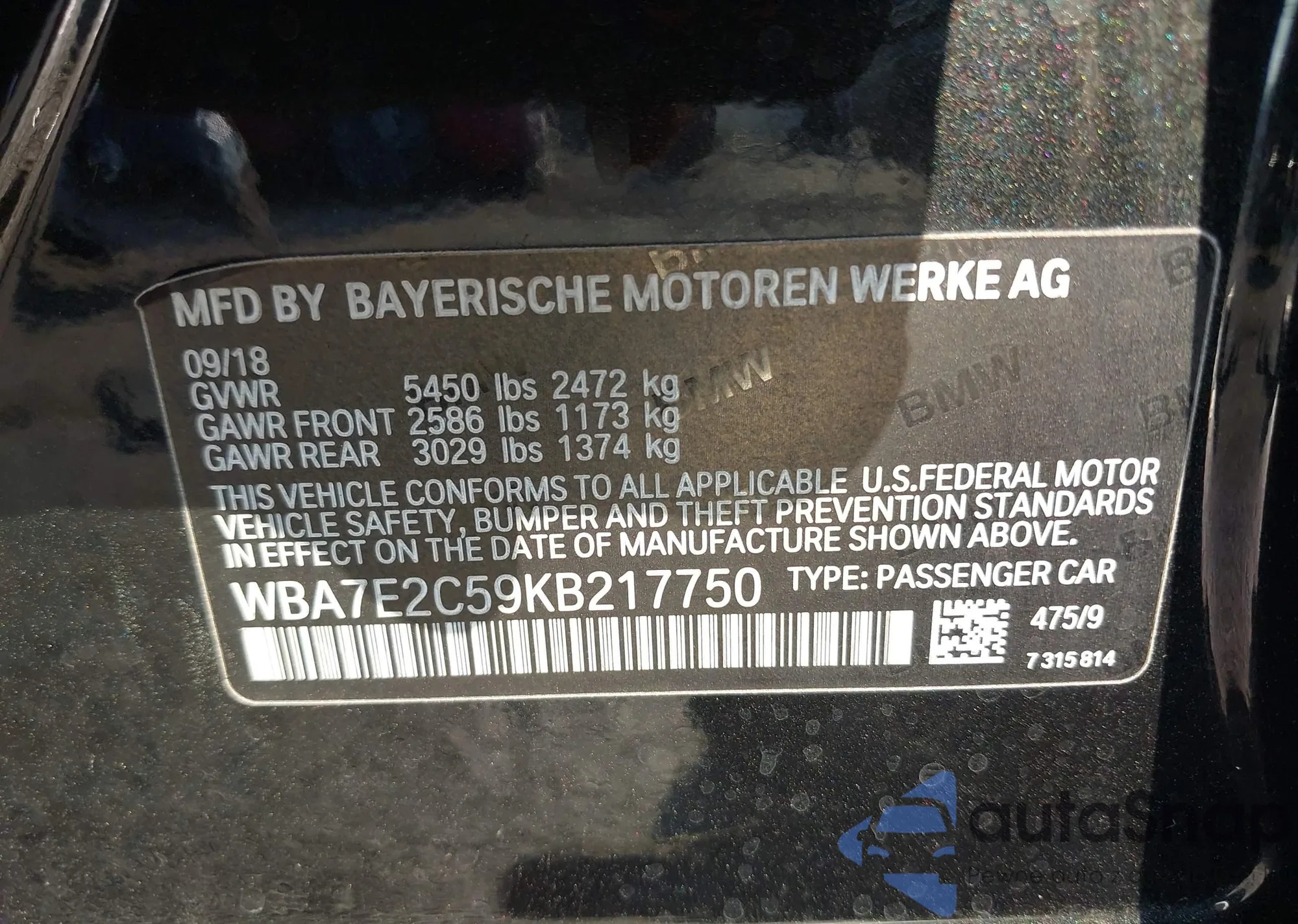 • VIN WBA7E2C59KB217750