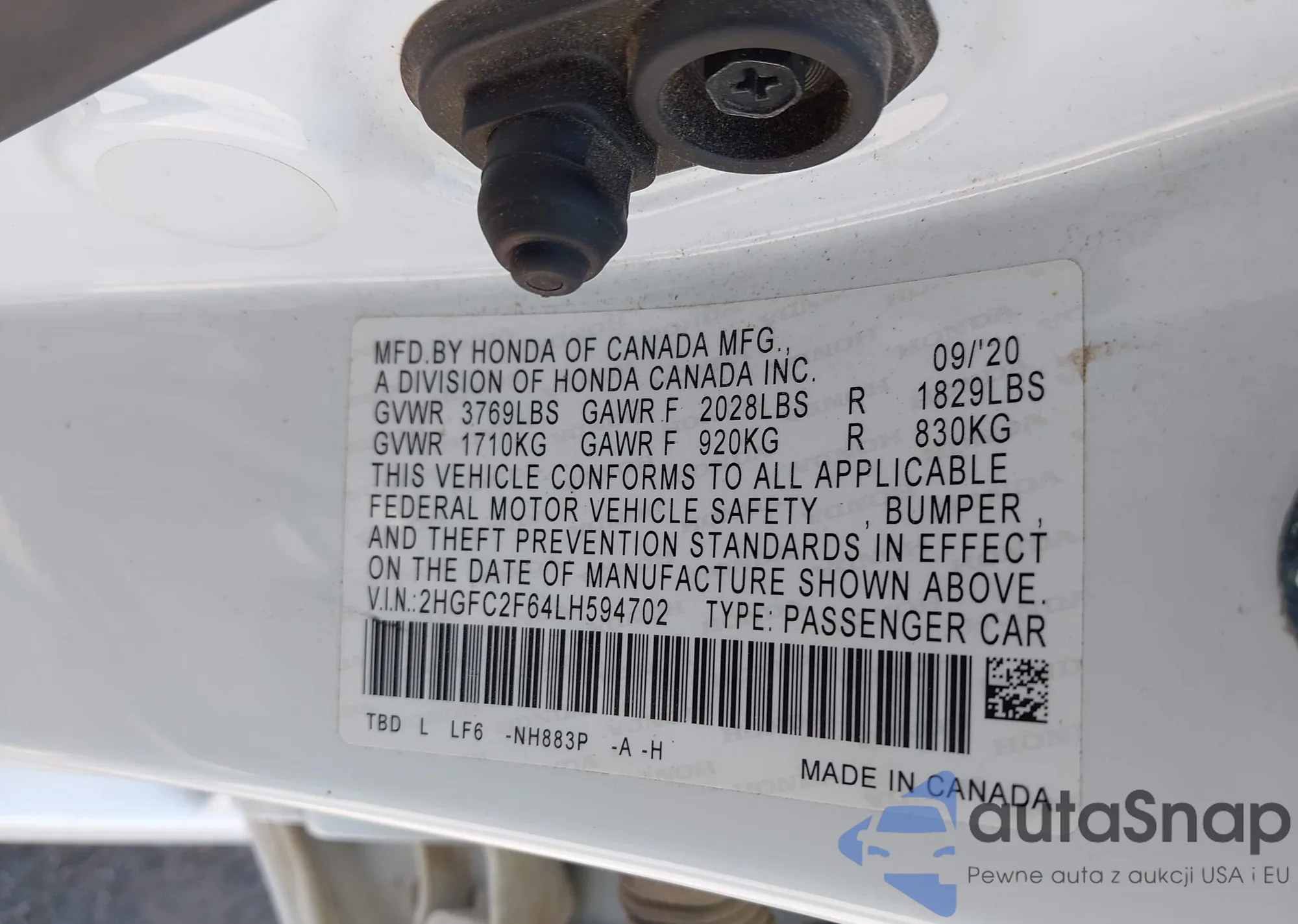 LOT: 42923317 VIN: 2HGFC2F64LH594702