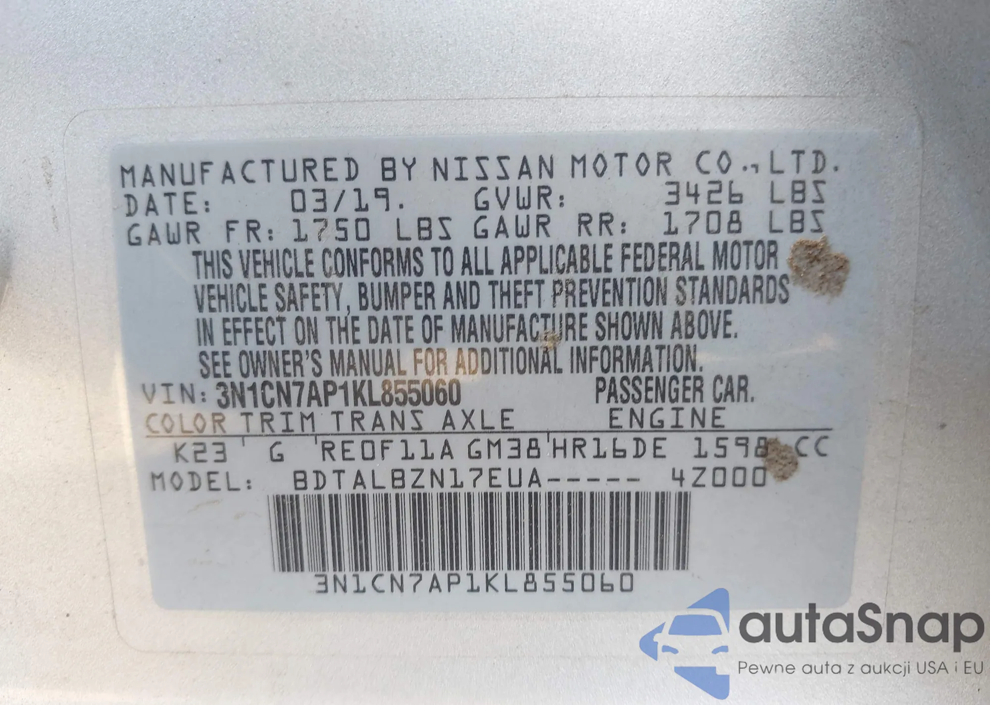 • VIN 3N1CN7AP0KL831252