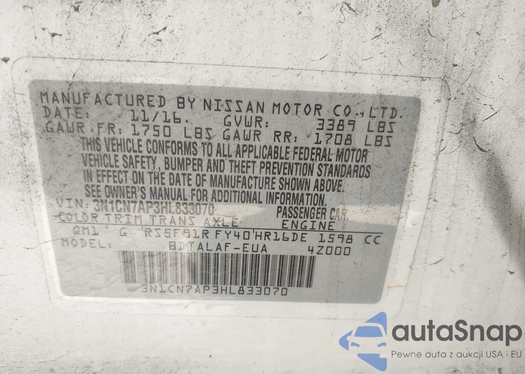 LOT: 43460405 VIN: JN1EV7AR1HM839563