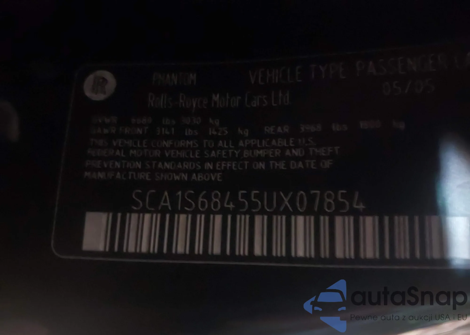 2005 Rolls-Royce Phantom z USA, uszkodzony, nr VIN SCA1S68455UX07854