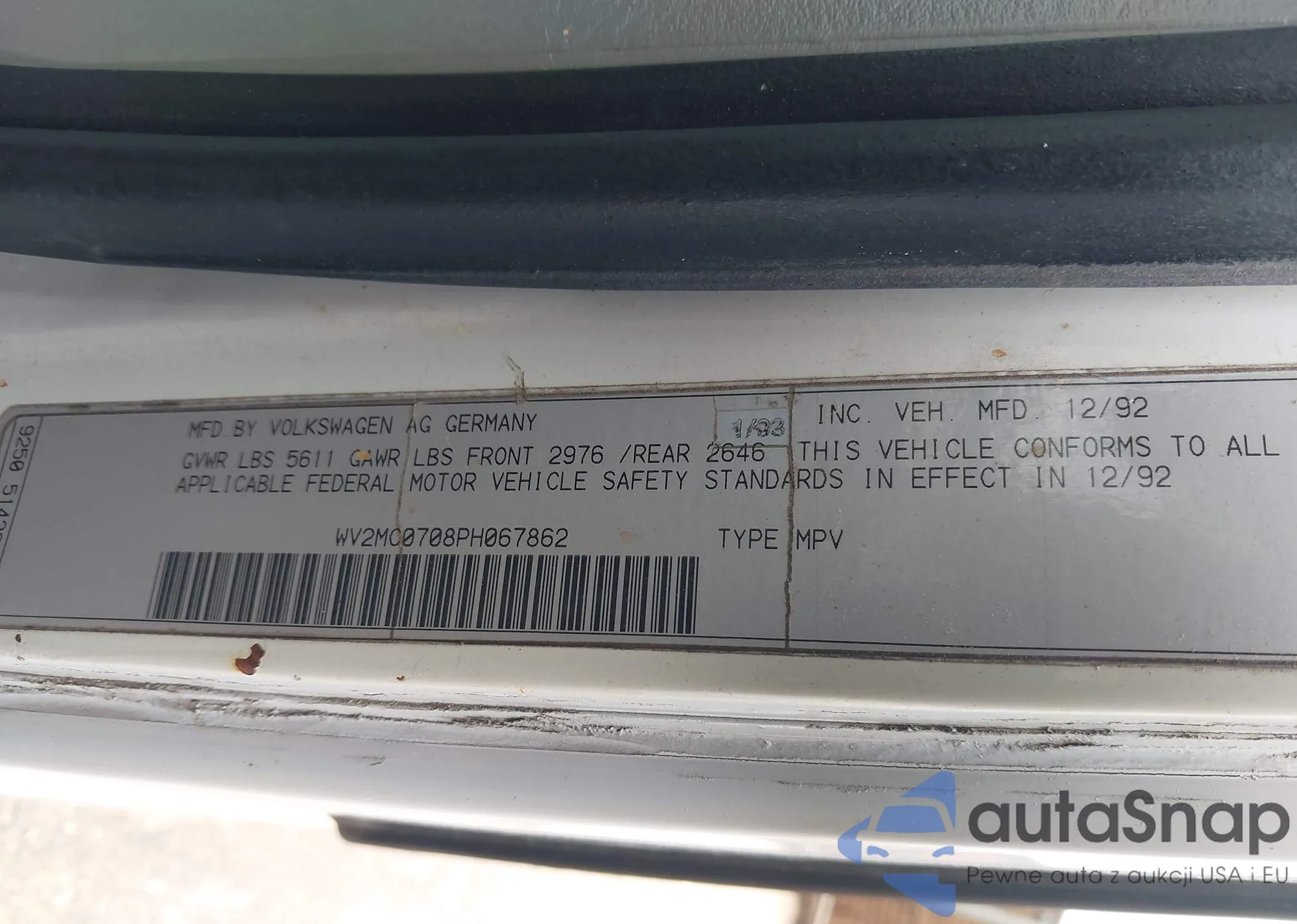 LOT: 43421853 VIN: WV2MC0708PH067862