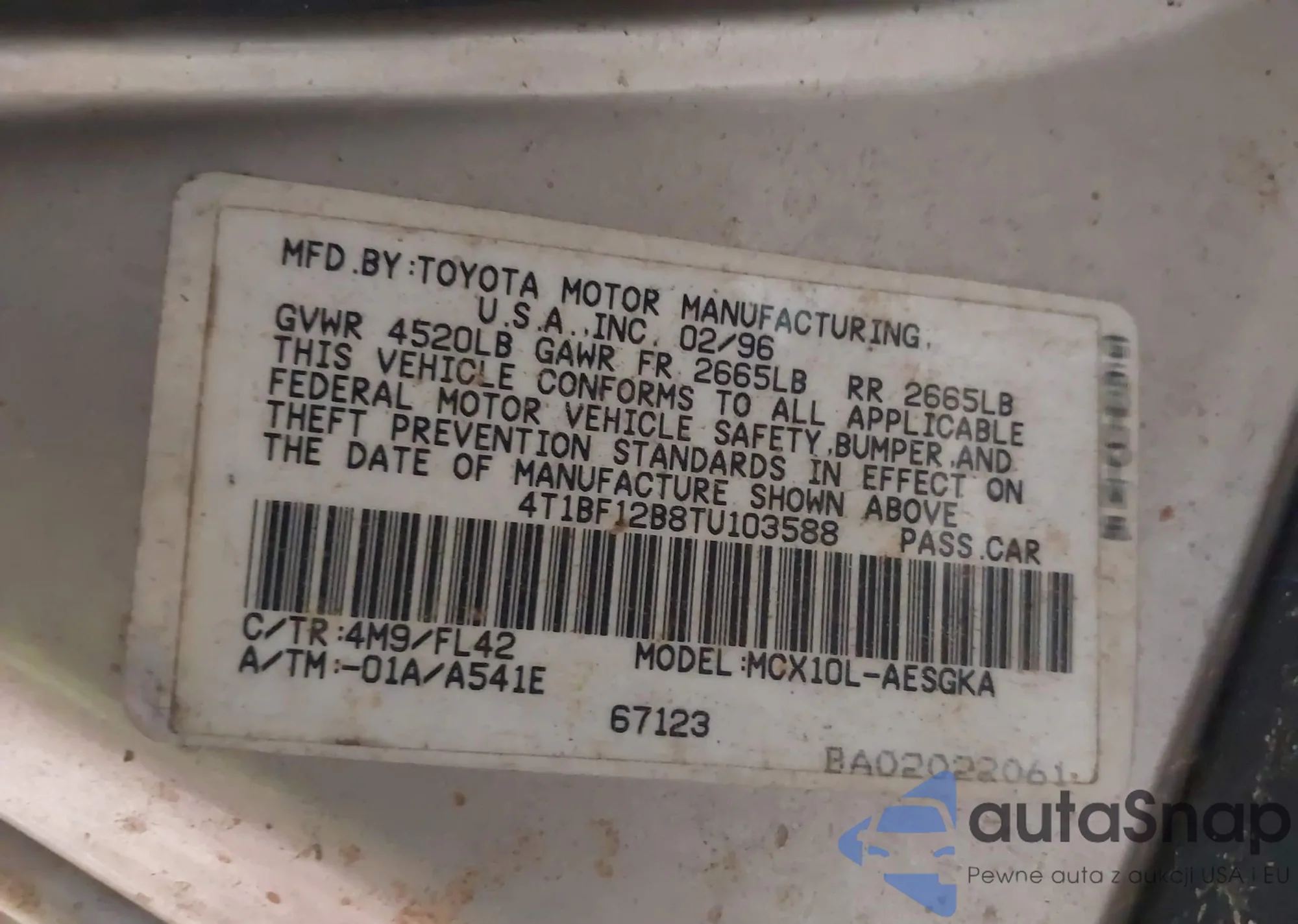 LOT: 42147728 VIN: 4T1BF12B8TU103588