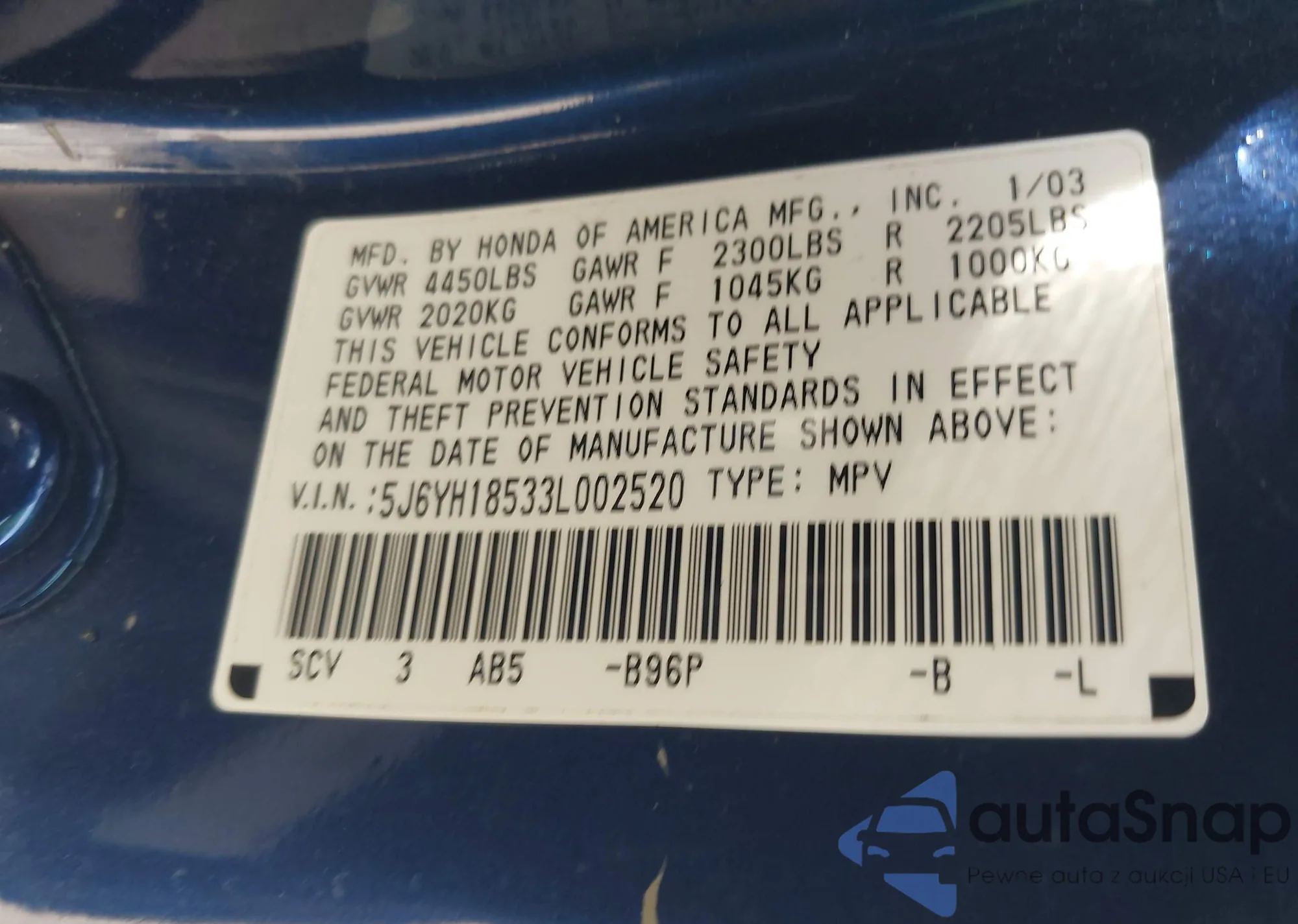 LOT: 41965768 VIN: 1HGCG5643XA037825